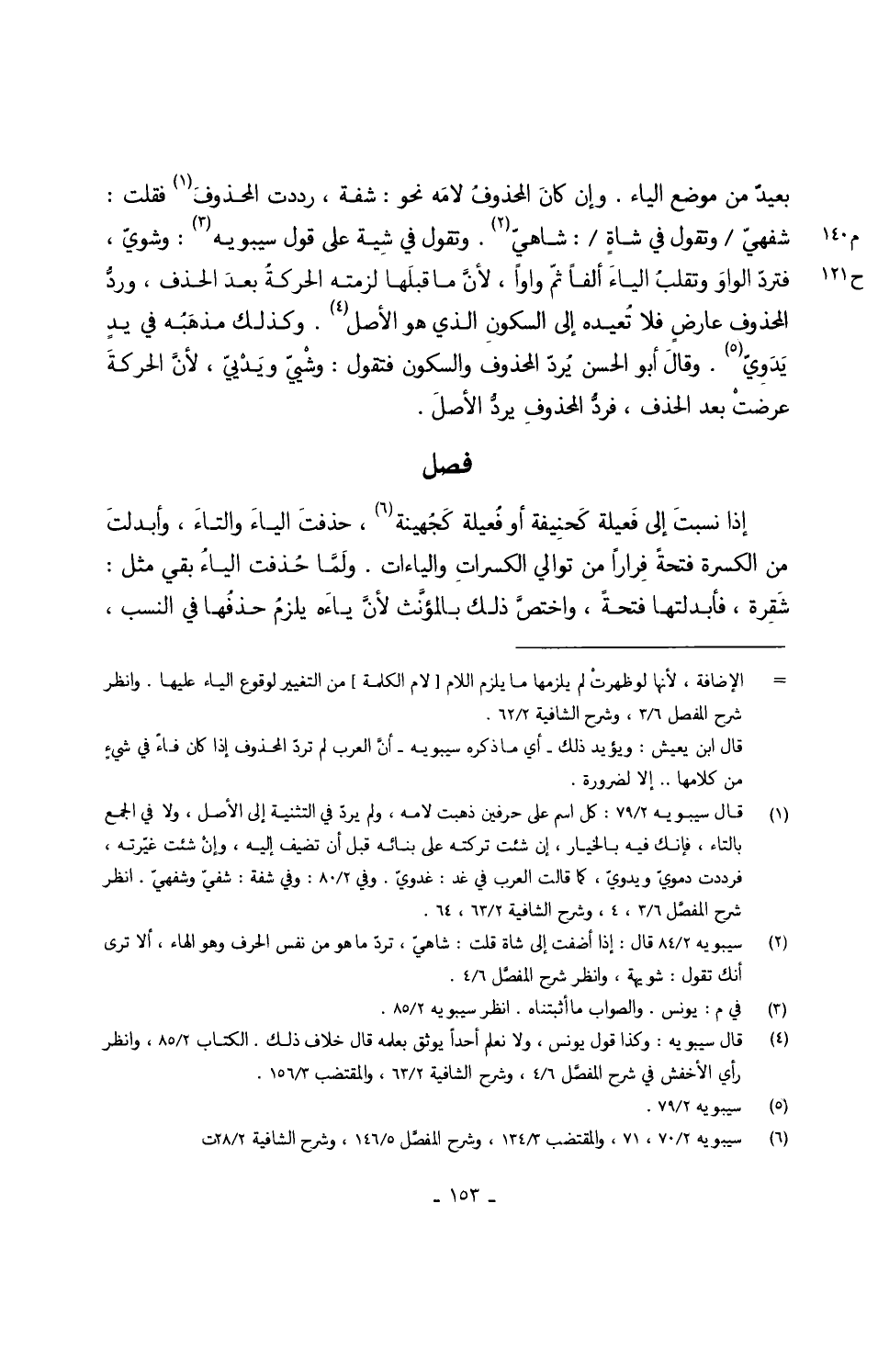 إِذا نسيتَ إِلَى فَعيلة كَحنِيفة أَو فُعيلة كَجُهينة حذفتَ الياءَ والتاءَ وأبدلتَ من الكسرة فَتْحة فِراراً من توالي الكسراتِ والياءات ولَمَّا حُذفت الياءُ بَقِي مثل شَقِرة فأبدلتها فَتْحة واختصَّ ذَلِك بالمؤنَّث لأنَّ ياءه يلزمُ حذفُها فِي النّسَب 154 والتغييرُ يؤنسُ بالتغيير أوْ لأنَّ المؤنَّث يُخفّفُ لئلاّ يجتمعَ ثِقَلُ اللَّفْظ وَالْمعْنَى فإنْ كَانَت العينُ واواً نَحْو حَويزة لم يُحذَف لِئَلَّا تنْقَلب الْوَاو ألفا لتحركها وانفتاح مَا قبلهَا وإنْ كانَ مضاعفاً نَحْو مُديدة لم يُحذف كَيْلا يلزمَ الْإِدْغَام وَقد خرجَ مِنْهُ شيءٌ على الأَصْل فَقَالُوا فِي السَّلفية سَلِيقيّ فأمَّا فَعُولة نَحْو شَنُوءة فمذهب سِيبَوَيْهٍ الحذفُ والفتحُ فَتَقول شَنَئيّ فِراراً من ثِقَل الضمِّ وَالْوَاو وَالْكَسْر وَالْيَاء وَقَالَ المبرِّج لَا يُغيَّر لأنَّ الْوَاو لَا تَثْقُل فِي النّسَب
