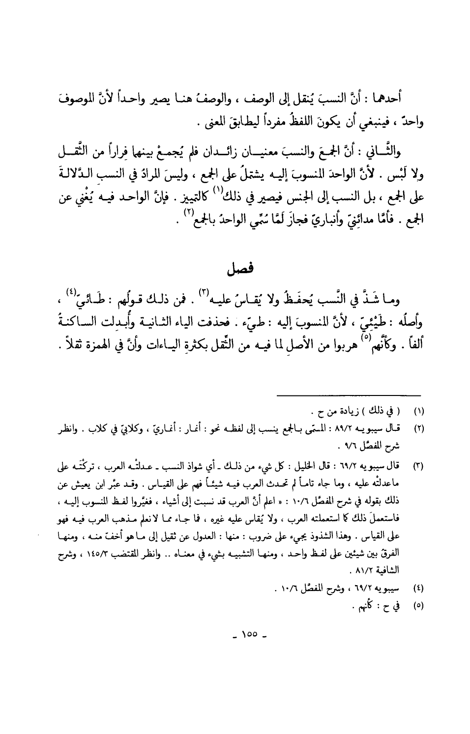 والثَّاني أنَّ الْجمع والنسبَ مَعْنيانِ زائدان فَلم يُجمعْ بَينهمَا فِراراً من الثِّقل وَلَا لَبْس لأنَّ الواحدَ المنسوبَ إِلَيْهِ يشتملُ على الْجمع وليسَ المرادُ فِي النسبِ الدَّلالةَ على الْجمع بل النّسَب إِلَى الْجِنْس فَيصير فِي ذَلِك كالتمييز فإنَّ الْوَاحِد فِيهِ يُغْنى عَن الْجمع فأمَّا مدائنيّ وأنباريّ فجازَ لَمَّا سُمِّي الواحدُ بِالْجمعِ
