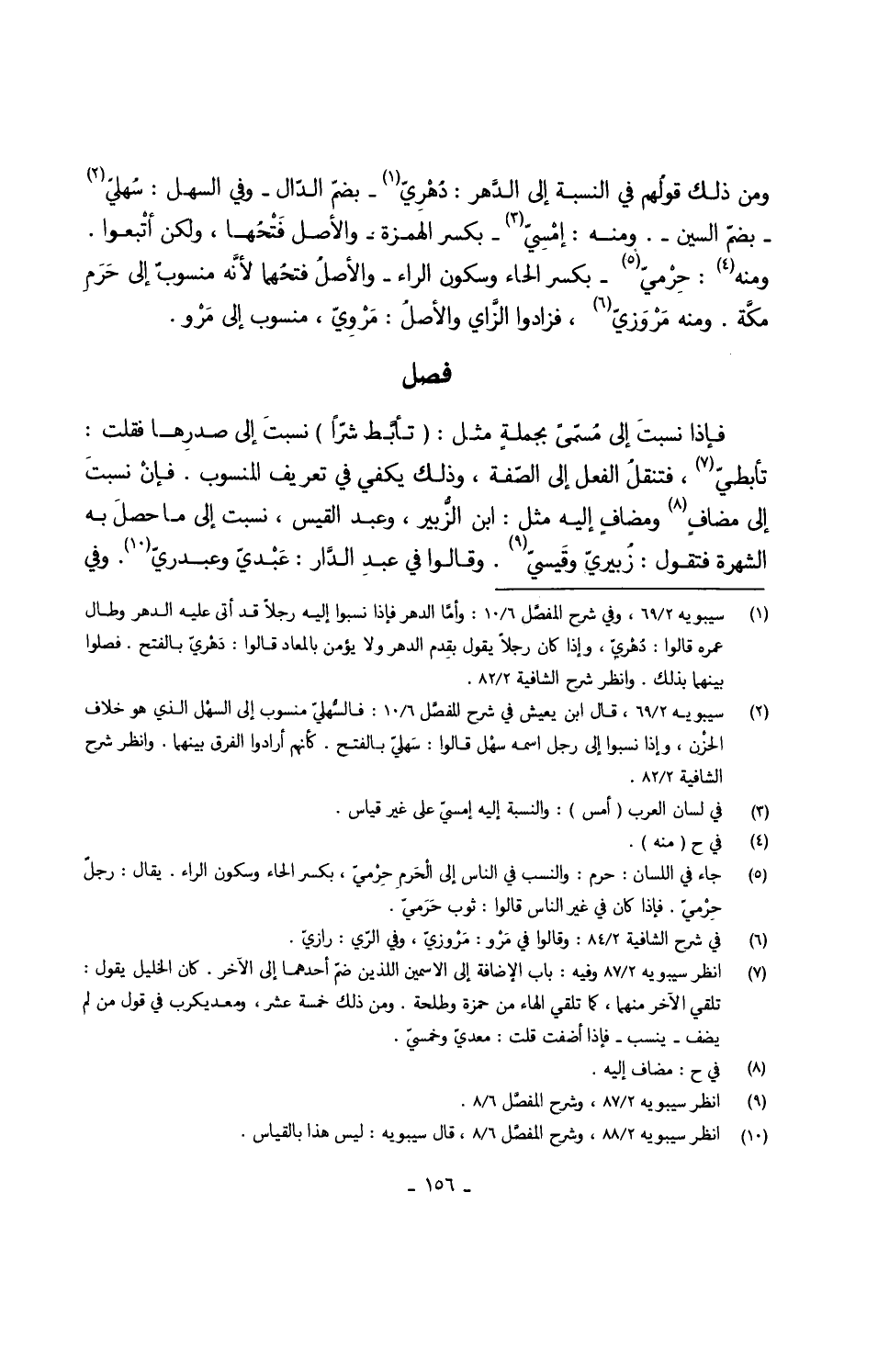 فَإِذا نسبتَ إِلَى مُسمّىً بجملةٍ مثل تأبَّط شرّاً نسبتَ إِلَى صدرِها فَقلت تأبطيّ فتنقلُ الْفِعْل إِلَى الصّفة وَذَلِكَ يَكْفِي فِي تَعْرِيف الْمَنْسُوب فإنْ نسبتَ إِلَى مضافٍ ومضافٍ إِلَيْهِ مثل ابْن الزُّبير وَعبد الْقَيْس نسبت إِلَى مَا حصلَ بِهِ الشُّهْرَة فَتَقول زُبيريّ وقَيسيّ وَقَالُوا فِي عبدِ الدَّار عبْديّ وعبدريّ وَفِي