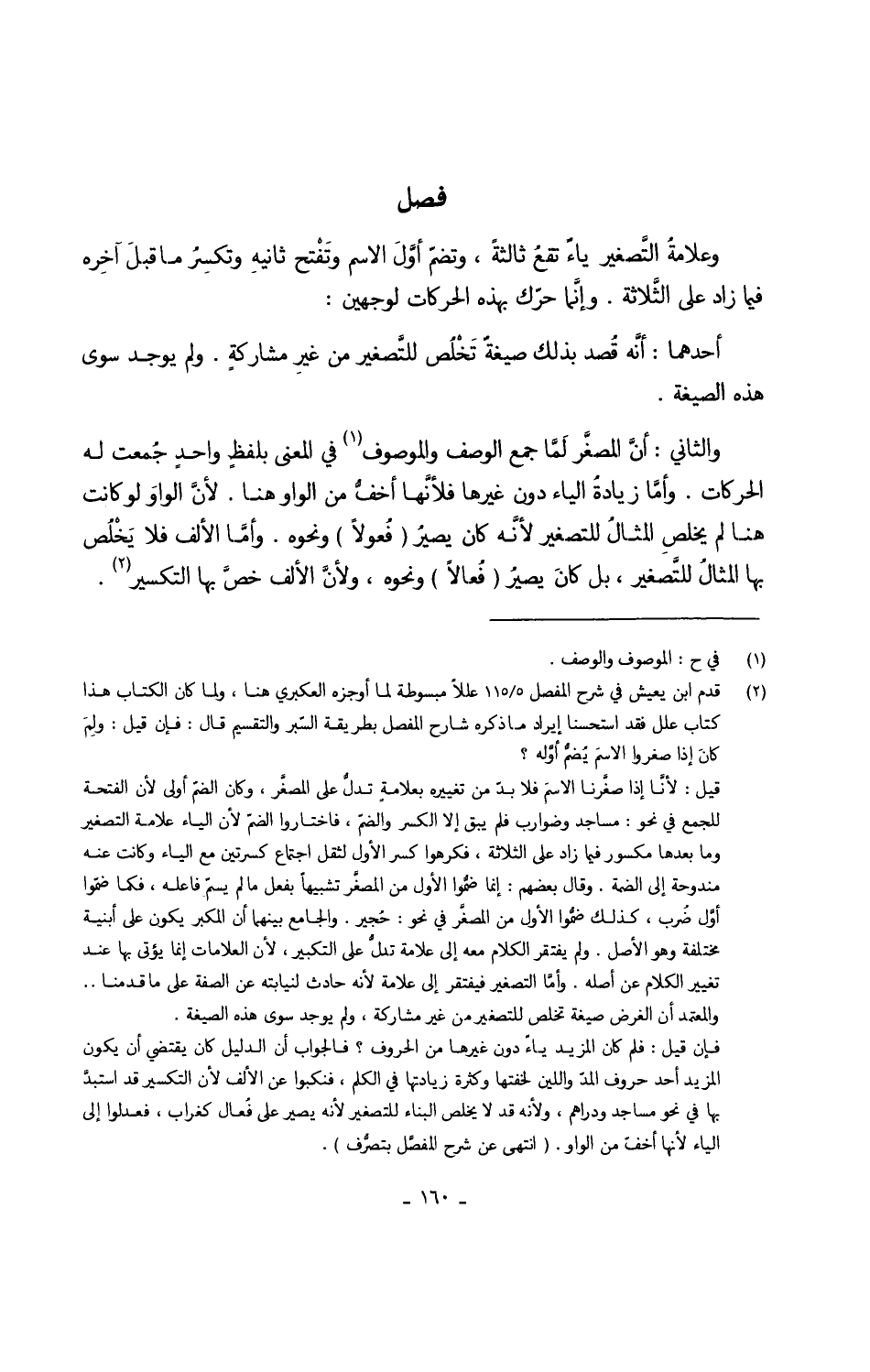 وَالثَّانِي أنَّ المصغَّر لَمَّا جمع الْوَصْف والموصوف فِي الْمَعْنى بلفظٍ واحدٍ جُمعت لَهُ الحركات وأمَّا زيادةُ الْيَاء دون غَيرهَا فلأنَّها أخفُّ من الْوَاو هُنَا لأنَّ الواوَ لَو كَانَت هُنَا لم يخلصِ المثالُ للتصغير لأنَّه كَانَ يصيرُ فُعولا وَنَحْوه وأمّا الْألف فَلَا يخلص بهَا المثالُ للتَّصغير بل كَانَ يصيرُ فُعالاً وَنَحْوه ولأنَّ الْألف خصَّ بهَا التكسير