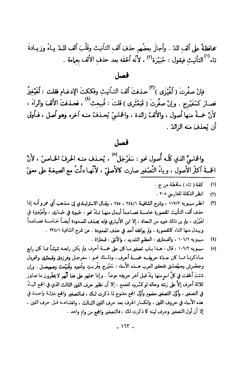 والخماسيُّ الَّذِي كلّه أُصول نَحْو سَفَرْجَل يُحذف مِنْهُ الحرفُ الخامسُ لأنَّ الخمسةَ أكثرُ الْأُصُول وياءُ التَّصْغير صَارَت كالأصليّ لأنَّها دلَّتْ مَعَ الصيغةِ على معنى