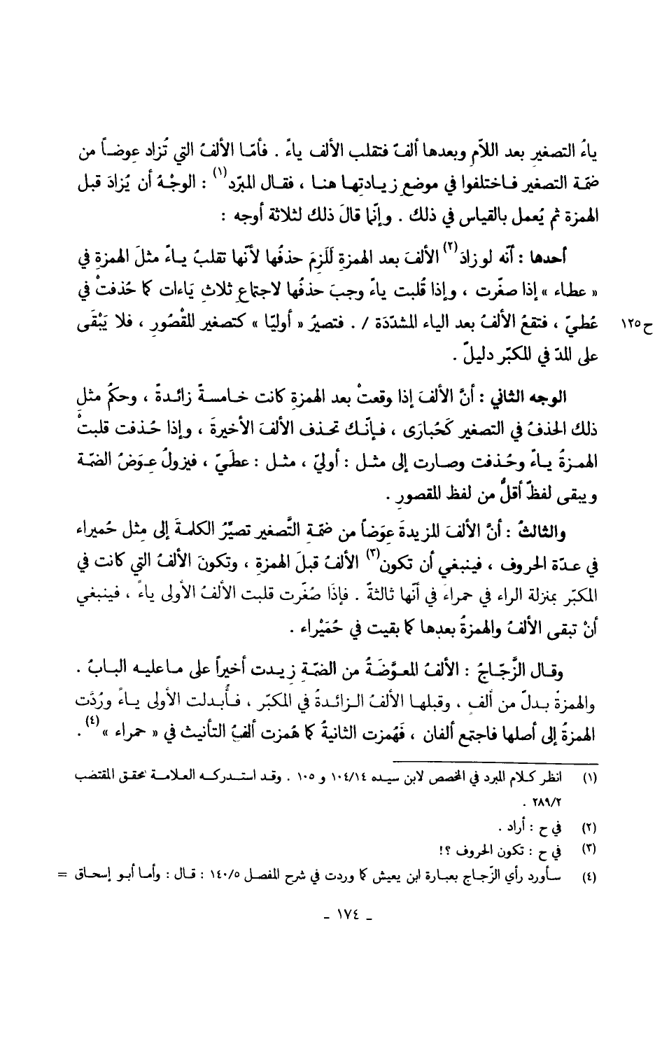 والثالثُ أنَّ الألفَ المزيدةَ عِوَضاً من ضمّةِ التَّصغير تصيَّرُ الكلمةَ إِلَى مثلِ حُميراء فِي عدّة الْحُرُوف فَيَنْبَغِي أَن تكون الألفُ قبلَ الهمزةِ وتكونَ الألفُ الَّتِي كَانَت فِي المكبّرِ بمنزلةِ الرَّاء فِي حمراءَ فِي أنّها ثالثةٌ فَإِذا صُغّرت قلبت الألفُ الأولى يَاء فَيَنْبَغِي أنْ تبقى الألفُ والهمزةُ بعْدهَا كَمَا بقيت فِي حُمَيْراء