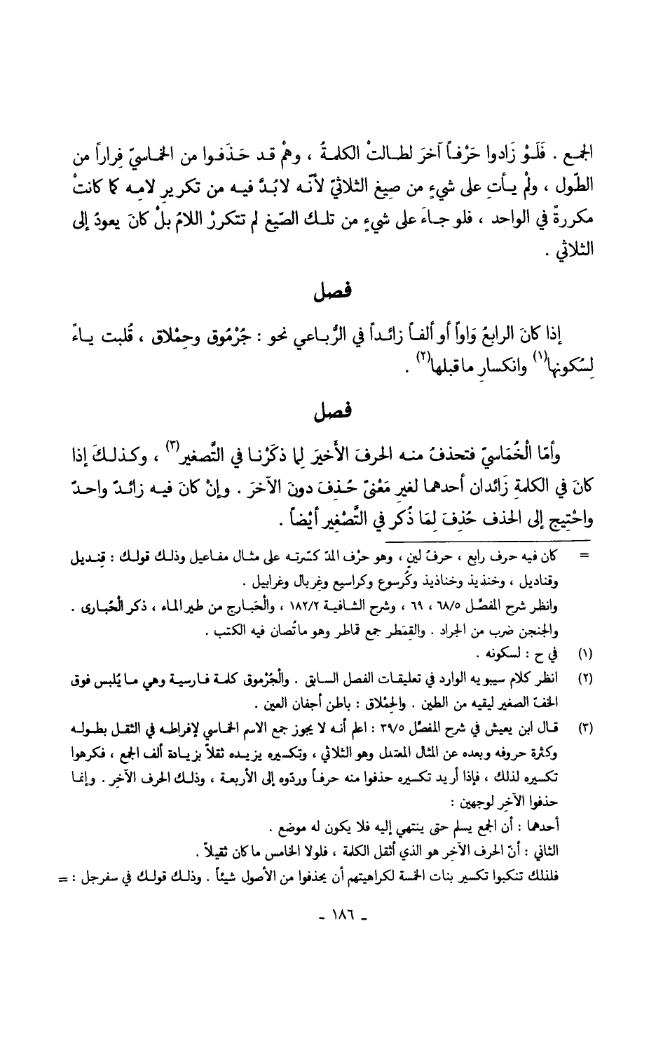 الْجمع فَلَوْ زَادوا حَرْفاً آخرَ لطالتْ الكلمةُ وهُم قد حَذَفوا من الخماسيَّ فِراراً من الطّول ولمْ يأتِ على شيءٍ من صِيغ الثلاثيّ لأنّه لَا بُدَّ فِيهِ من تكريرِ لامِه كَمَا كانتْ مكررةً فِي الْوَاحِد فَلَو جاءَ على شيءٍ من تِلْكَ الصّيغ لم تتكررْ اللامُ بلْ كانَ يعودُ إِلَى الثلاثي