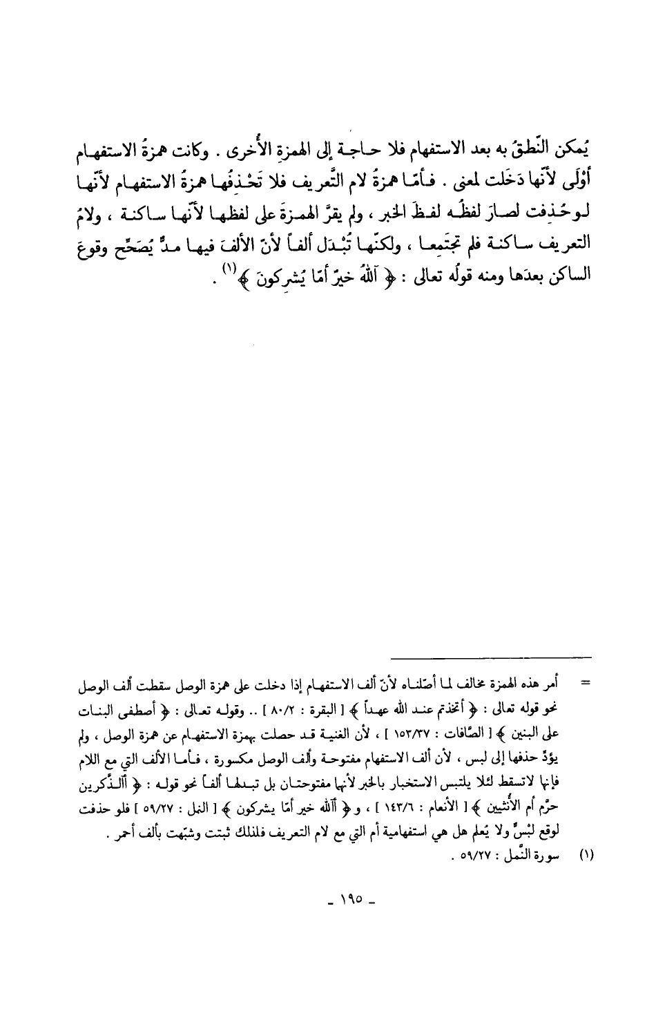 يُمكن النّطقُ بِهِ بعد الِاسْتِفْهَام فَلَا حَاجَة إِلَى الهمزةِ الأُخرى وَكَانَت همزةُ الِاسْتِفْهَام أوْلَى لأنّها دَخَلت لِمَعْنى فأمّا همزةُ لَام التَّعريف فَلَا تَحْذِفُها همزةُ الِاسْتِفْهَام لأنّها لَو حُذِفت لصارَ لَفظه لفظَ الْخَبَر وَلم يقرَّ الهمزةَ على لَفظهَا لأنَّها سَاكِنة ولامُ التَّعْرِيف سَاكِنة فَلم تجتَمِعا ولكنّها تُبْدَل ألفا لأنّ الألفَ فِيهَا مدٌّ يُصَحِّح وقوعَ السَّاكِن بعدَها وَمِنْه قَوْله تَعَالَى {آللَّهُ خيرٌ أمّا يُشرِكونَ}