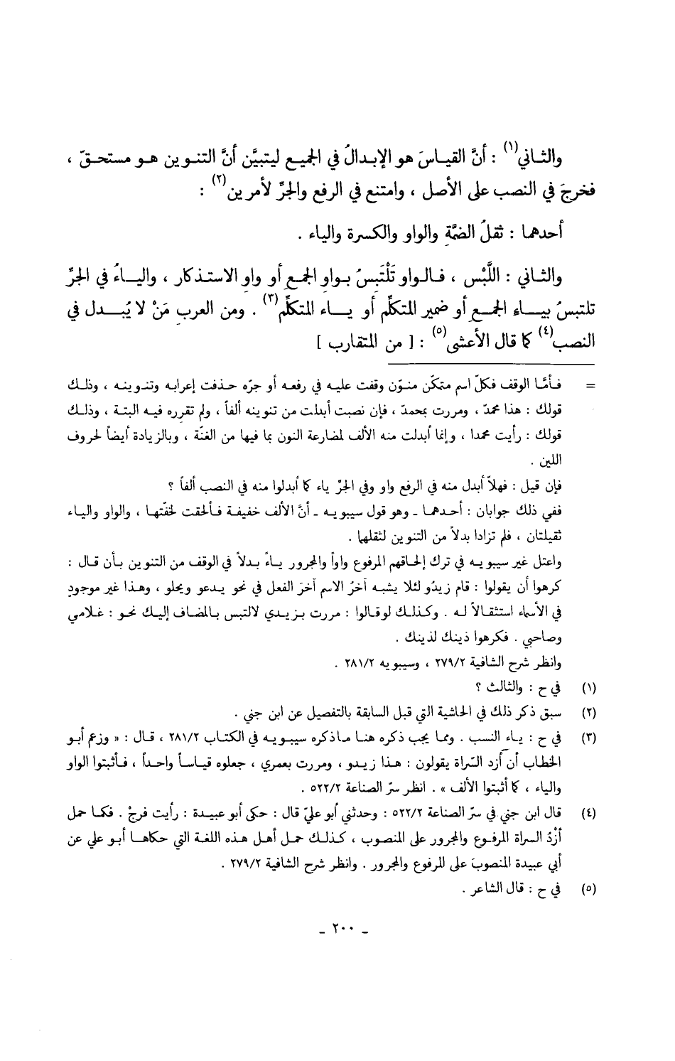 وَالثَّانِي أنَّ القياسَ هُوَ الإبدالُ فِي الْجَمِيع ليتبيَّن أنَّ التَّنْوِين هُوَ مستحقّ فخرجَ فِي النصب على الأَصْل وَامْتنع فِي الرّفْع والجرِّ لأمرين