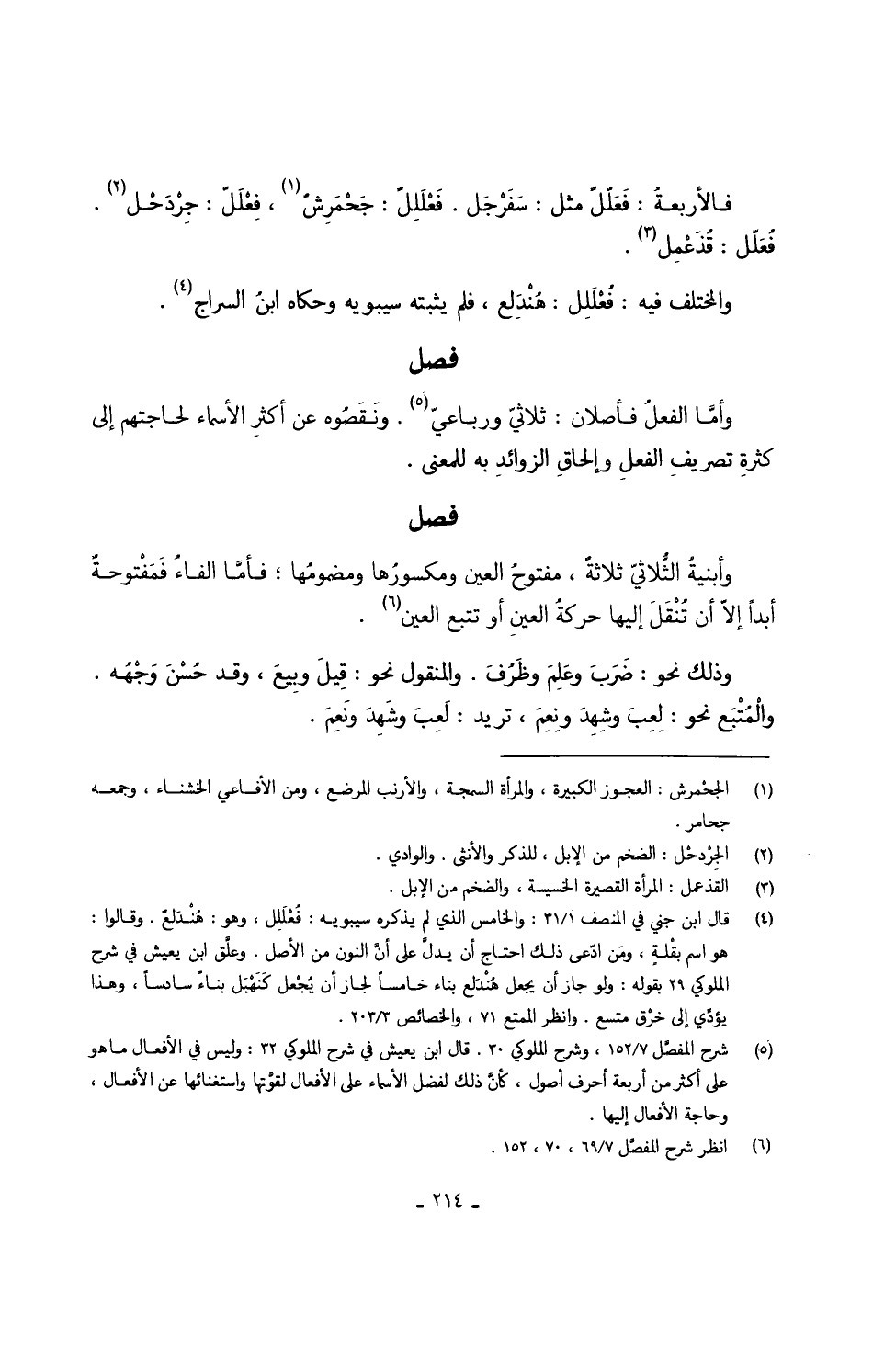 وأمَّا الفعلُ فأصلان ثلاثيّ ورباعيّ ونَقَصُوه عَن أكثرِ الأٍسماء لحاجتهم إِلَى كثرةِ تصريفِ الفعلِ وإلحاقِ الزوائدِ بِهِ للمعنى