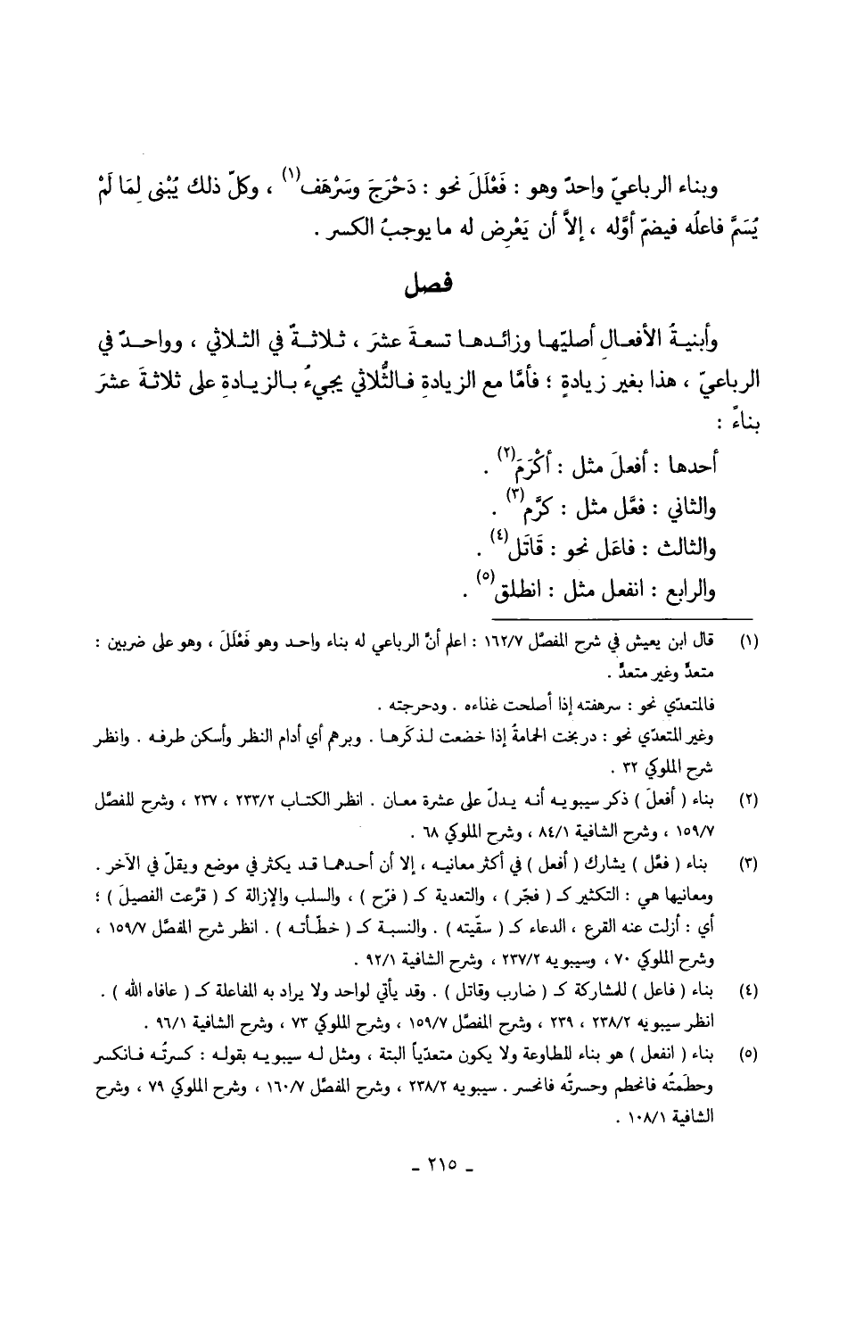 وابنيةُ الأفعالِ أصليّها وزائدها تسعةَ عشرَ ثلاثةٌ فِي الثلاثي وواحدٌ فِي الرباعيّ هَذَا بِغَيْر زيادةٍ فأمَّا مَعَ الزيادةِ فالثُّلاثي يجيءُ بالزيادةِ على ثلاثةَ عشرَ بِنَاء