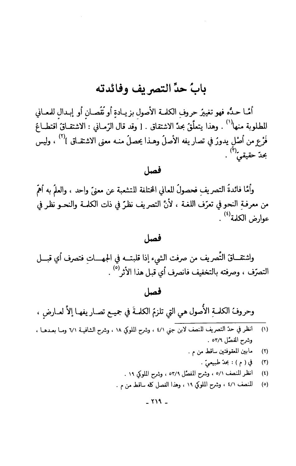 أمَّا حدُّه فَهُوَ تغييرُ حروفِ الْكَلِمَة الأصولِ بزيادةٍ أَو نُقٌصانٍ أَو إبدالٍ للمعاني الْمَطْلُوبَة مِنْهَا وَهَذَا يتعلَّقُ بحدِّ الِاشْتِقَاق وَقد قالَ الرّماني الاشتقاقُ اقتطاعُ فَرْعٍ من أصْلٍ يدورُ فِي تصاريفه الأصلُ وَهَذَا يحصلُ مِنْهُ معنى الِاشْتِقَاق وَلَيْسَ بحدّ حقيقيّ