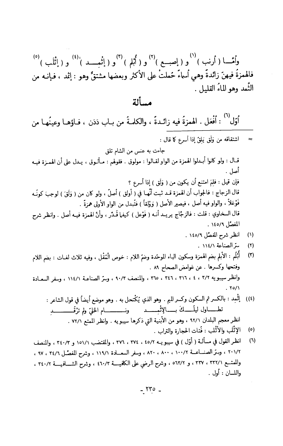 وأمَّا أرنب وإصبع وأُبْلم وإثْمِد وإثْلَب فالهمزةُ فيهنّ زائدةٌ وَهِي أسماءٌ حُملتْ على الْأَكْثَر وَبَعضهَا مشتقٌّ وَهُوَ إثمد فَإِنَّهُ من الثَّمد وَهُوَ الماءُ الْقَلِيل