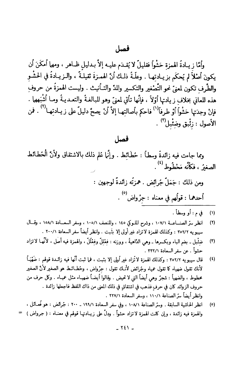 وأمَّا زيادةُ الهمزةِ حَشْواً فقليلٌ لَا يُقدّم عَلَيْهِ إلاَّ بدليلٍ ظَاهر وَمهما أمكَنَ أَن يكونَ أصْلاً لم يُحكَم بزيادتها وعلّةُ ذَلِك انَّ الهمزةَ ثقيلةٌ والزيادةُ فِي الحشْوِ والطَّرفِ تكون لِمَعْنى نَحْو التَّصْغير والتكسير والمدِّ والتأنيث وَلَيْسَت الهمزةُ من حروفِ هَذِه الْمعَانِي بخلافِ زيادتها أوّلاً فإنَّها تَأتي لِمَعْنى وَهُوَ المبالغةُ والتعديةُ وَمَا أشْبَههما فإنْ وجدتَها حَشْواً أوْ طرفا فاحكم بأصالتِها إلاَّ أنْ يصحَّ دليلٌ على زيادتِها فَمن الْأُصُول زِئْبق وضِئْبِل