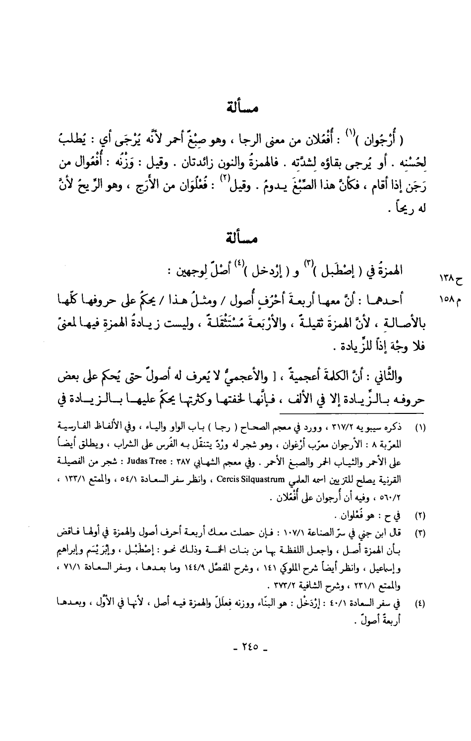أَحدهمَا أنَّ مَعهَا أربعةَ أحْرُفٍ أُصول ومثلُ هَذَا يحكمُ على حروفها كلّها بالأصالةِ لأنَّ الهمزةَ ثقيلةٌ والأرْبَعةَ مُسْتَثْقَلةٌ وَلَيْسَت زيادةُ الهمزةِ فِيهَا لِمَعْنى فَلَا وجْهَ إِذا للزِّيادة