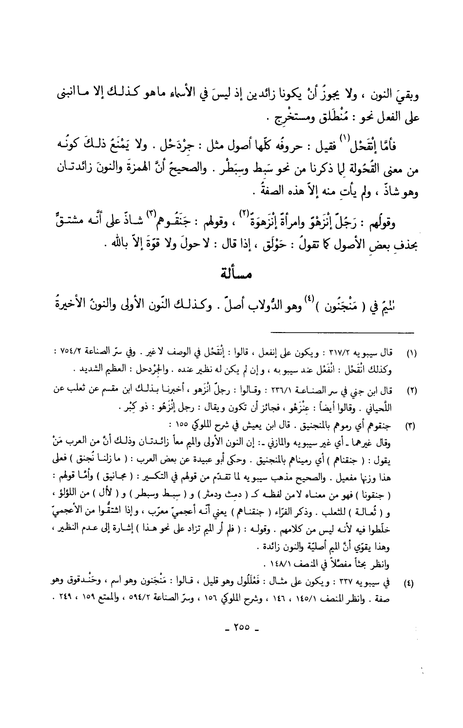وبقيَ النُّون وَلَا يجوزُ أنْ يَكُونَا زائدين إِذْ ليسَ فِي الْأَسْمَاء مَا هُوَ كَذَلِك إِلَّا مَا انبنى على الْفِعْل نَحْو مُنْطَلق ومستخْرِج