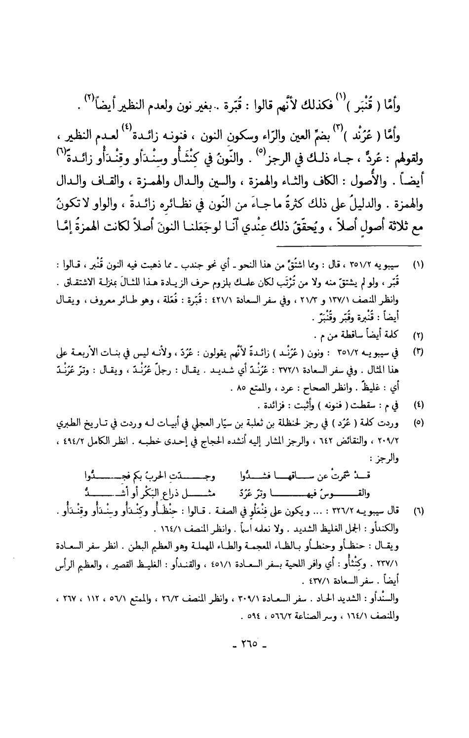 وأمَّا عُرُنْد بضمِّ الْعين والرّاء وسكونِ النُّون فنونه زَائِدَة لعدم النظير ولقولهم عُردٌّ جَاءَ ذَلِك فِي الرجز والنّونُ فِي كِنْثَأْو وسِنْدَأو وقِنْدَأْو زائدةٌ أَيْضا والأُصول الْكَاف والثاء والهمزة وَالسِّين وَالدَّال والهمزة وَالْقَاف وَالدَّال والهمزة والدليلُ على ذَلِك كثرةُ مَا جاءَ من النّون فِي نظائرِه زَائِدَة وَالْوَاو لَا تكونُ مَعَ ثَلَاثَة أصولٍ أصلا ويُحقّقُ ذَلِك عِنْدي أنّا لَو جَعَلنا النونَ أصلا لكَانَتْ الهمزةُ إمَّا