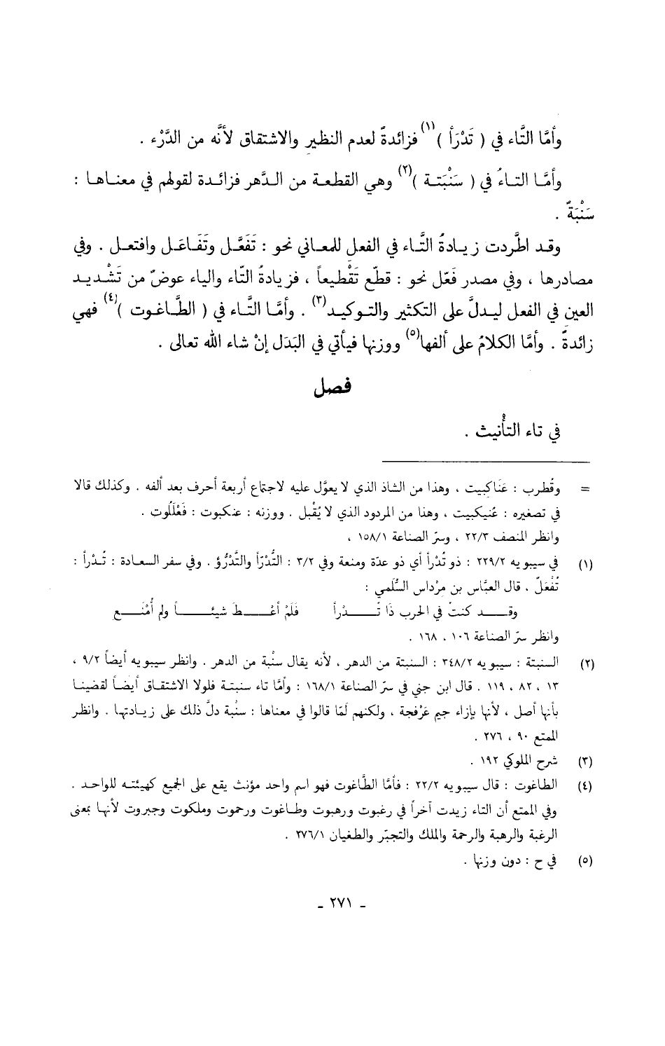 وَقد اطَّردت زيادةُ التَّاء فِي الفعلِ للمعاني نَحْو تَفَعَّل وتَفَاعَل وافتعل وَفِي مصادرها وَفِي مصدر فَعّل نَحْو قطّع تَقْطيعاً فزيادةُ التّاء وَالْيَاء عوضٌ من تَشْديد العينِ فِي الْفِعْل ليدلَّ على التكثير والتوكيد وأمَّا التَّاء فِي الطَّاغوت فَهِيَ زائدةٌ وأمَّا الكلامُ على ألفها ووزنها فَيَأْتِي فِي البَدَل إنْ شَاءَ الله تَعَالَى