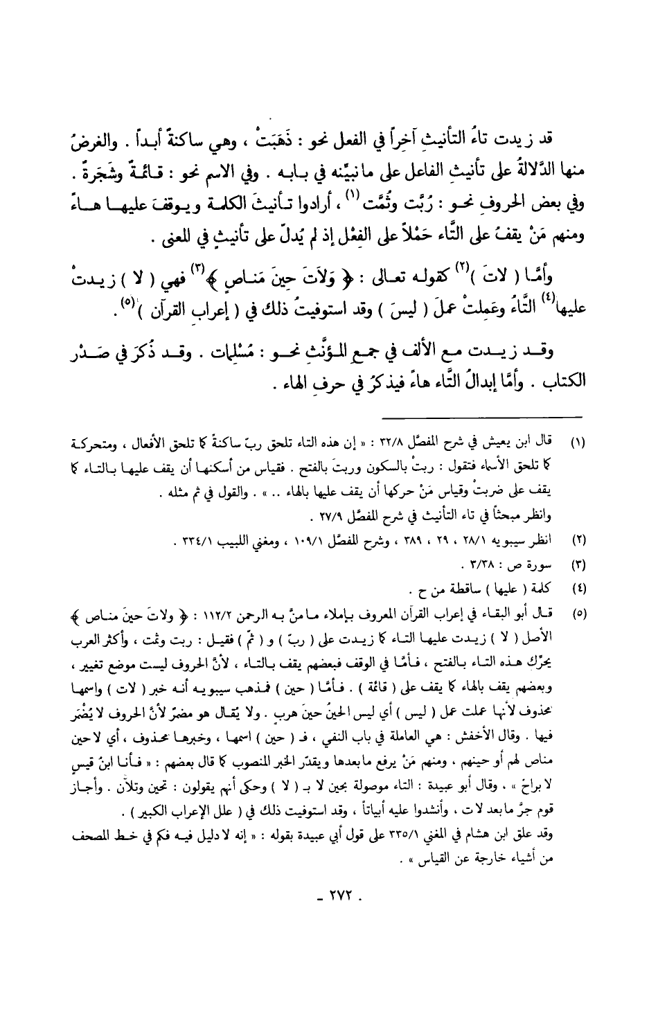 قد زيدت تاءُ التأنيثِ آخرِاً فِي الْفِعْل نَحْو ذَهَبَتْ وَهِي ساكنةٌ أبدا والغرضُ مِنْهَا الدَّلالةُ على تأنيثِ الْفَاعِل على مَا نبيِّنه فِي بَابه وَفِي الِاسْم نَحْو قائمةٌ وشَجَرةٌ وَفِي بعض الحروفِ نَحْو رُبَّت وثُمَّت أَرَادوا تأنيثَ الْكَلِمَة ويوقفَ عَلَيْهَا هاءٌ وَمِنْهُم مَنْ يقفُ على التَّاء حَمْلاً على الفِعْل إِذْ لم يُدلّ على تأنيثٍ فِي الْمَعْنى