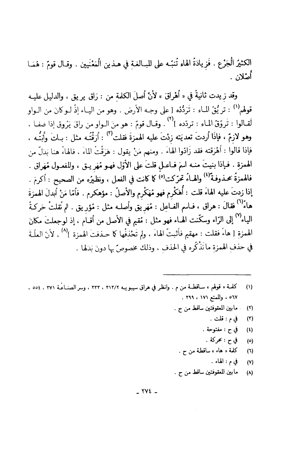وَقد زيدت ثَانِيَة فِي أهْراقَ لأنَّ أصلَ الكلمةِ من رَاق يريق وَالدَّلِيل عَلَيْهِ قَوْلهم تريُّقُ الماءِ تَرَدُّدُه على وَجه الأَرْض وَهُوَ من الْيَاء إذْ لَو كانَ من الْوَاو لَقالوا تَروّقُ الماءِ تردّده وَقَالَ قومٌ هُوَ منَ الْوَاو من راقَ يَرُوق إِذا ضفا وَهُوَ لازِمٌ فَإِذا أردتَ تعديَته زِدْتَ عَلَيْهِ الْهمزَة فَقلت أرَقْتُه مثل باتَ وأَبَتُّه فَإِذا قَالُوا أهْرَقته فقد زَادُوا الهاءَ وَمِنْهُم مَنْ يَقُول هَرَقْتُ الماءَ فالهاءُ هُنَا بَدَلٌ من الهمزةِ فَإِذا بنيتَ مِنْهُ اسمَ فاعلٍ قلتَ على الأوّل فَهُوَ مُهَرِيق وَالْمَفْعُول مُهَراق فالهمزةُ محذوفةٌ والهاءُ تحرّكت كَمَا كَانَت فِي الْفِعْل ونظيرُه من الصَّحِيح أكرمَ إِذا زدتَ عَلَيْهِ الهاءَ قلت أُهَكْرِم فَهُوَ مُهَكْرِم والأصلُ مؤهكرم فأمّا مَنْ أبدلَ الْهمزَة هَاء فقالَ هراق فاسم الفاِعل مُهَرِيق واصله مثل مُؤرِيق ثمَّ نُقلتْ حَركةُ الْيَاء إِلَى الرّاء وسكّنت الْهَاء فَهُوَ مثل مُقيم فِي الأَصْل من أَقَامَ إِذْ لَو جعلتَ مكانَ الهَمزةِ هَاء فَقلت مهقيم فأثبتَ الهاءَ وَلم تَحْذِفْها كَمَا حذفت الْهمزَة لأنّ العلّةَ فِي حذفِ الهمزةِ مَا نَذْكُره فِي الحذفِ وَذَلِكَ مخصوصٌ بهَا دون بدلهَا