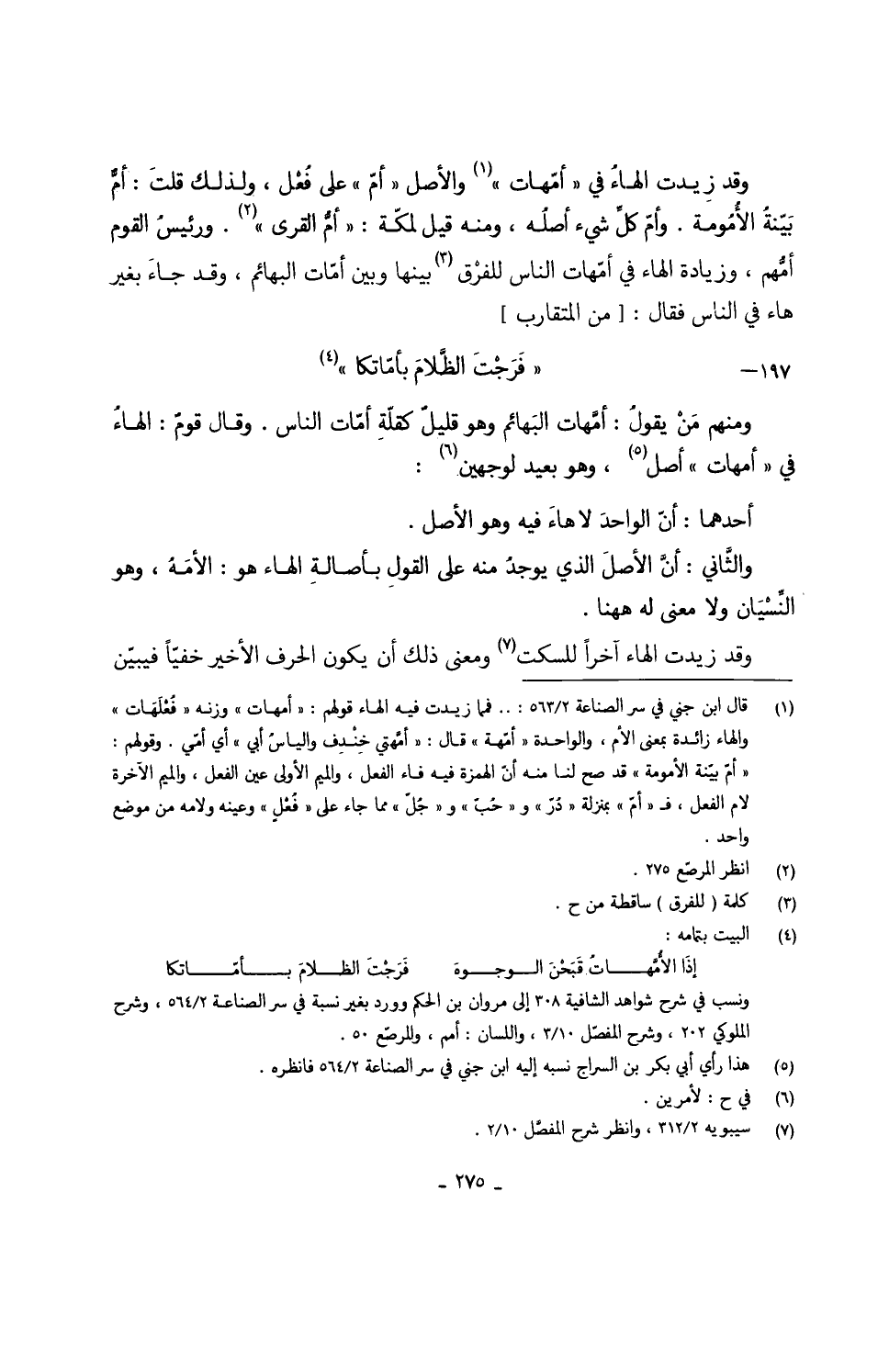 وَقد زِيدت الهاءُ فِي أمّهات وَالْأَصْل أمّ على فُعْل وَلذَلِك قلتَ أمٍّ بَيّنةُ الأُمُومة وأمّ كلٍّ شيئ أصلُه وَمِنْه قيل لمكّة أمُّ الْقرى ورئيسُ الْقَوْم أمُّهم وَزِيَادَة الْهَاء فِي أمّهات النَّاس للفرْق بَينهَا وَبَين أمّات الْبَهَائِم وَقد جاءَ بِغَيْر هَاء فِي النَّاس فَقَالَ من // المتقارب // ( ... فَرَجْتَ الظَّلامَ بأمّاتكا)