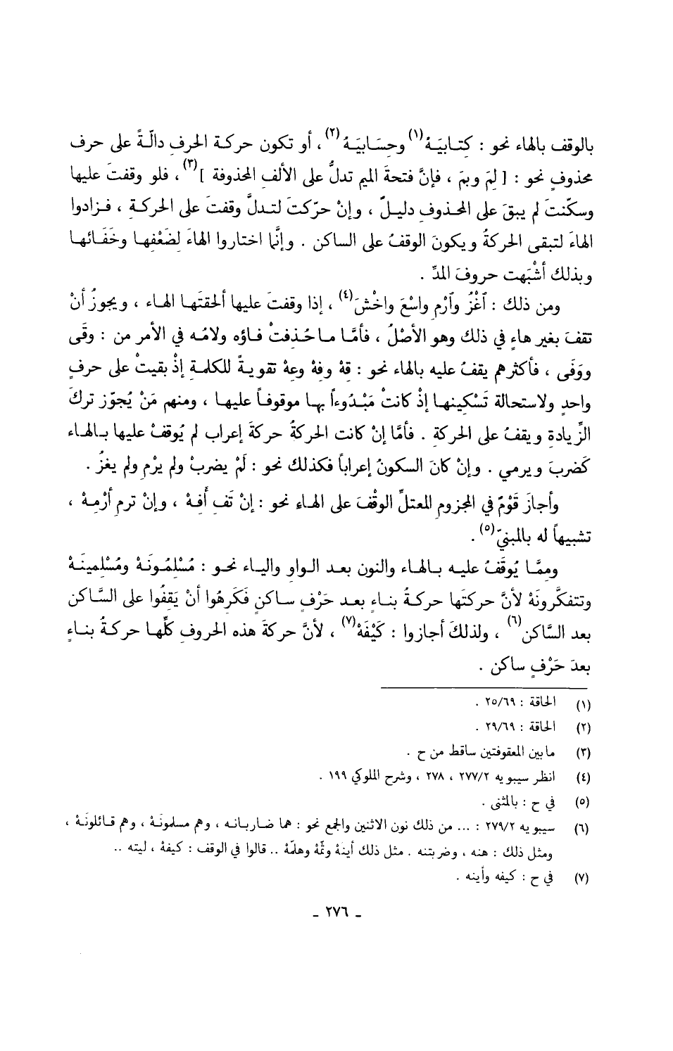 ومِمَّا يُوقَفُ عَلَيْهِ بِالْهَاءِ وَالنُّون بعد الواوِ وَالْيَاء نَحْو مُسْلِمُونَهْ ومُسْلِمينَهْ وتتفكَّرونَهْ لأنَّ حركتَها حركةُ بناءٍ بعد حَرْفٍ ساكنٍ فَكَرِهُوا أنْ يَقِفُوا على السَّاكن بعد السَّاكن وَلذَلِك أَجَازُوا كَيْفَهْ لأنَّ حركةَ هَذِه الحروفِ كلِّها حركةُ بناءٍ بعدَ حَرْفٍ سَاكن