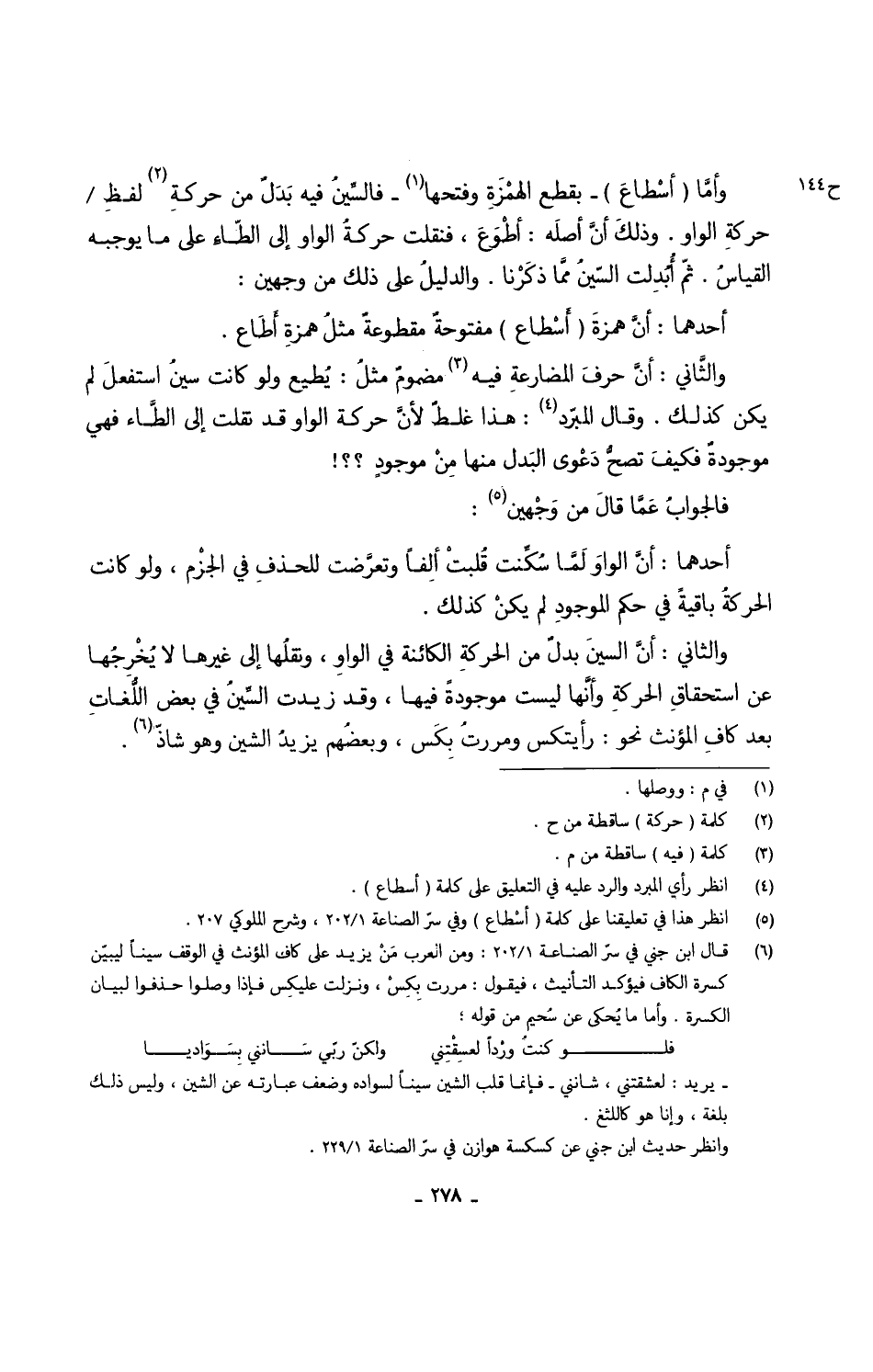 وأمَّا أسْطاعَ بِقطع الهمْزَةِ وَفتحهَا فالسِّينُ فِيهِ بَدَلٌ من حركةِ لفظِ حركةِ الْوَاو وذلكَ أنَّ أصلَه أطْوَعَ فنقلت حركةُ الْوَاو إِلَى الطّاءِ على مَا يُوجِبهُ القياسُ ثمَّ أُبْدِلت السّينُ ممَّا ذكَرْنا والدليلُ على ذَلِك من وَجْهَيْن