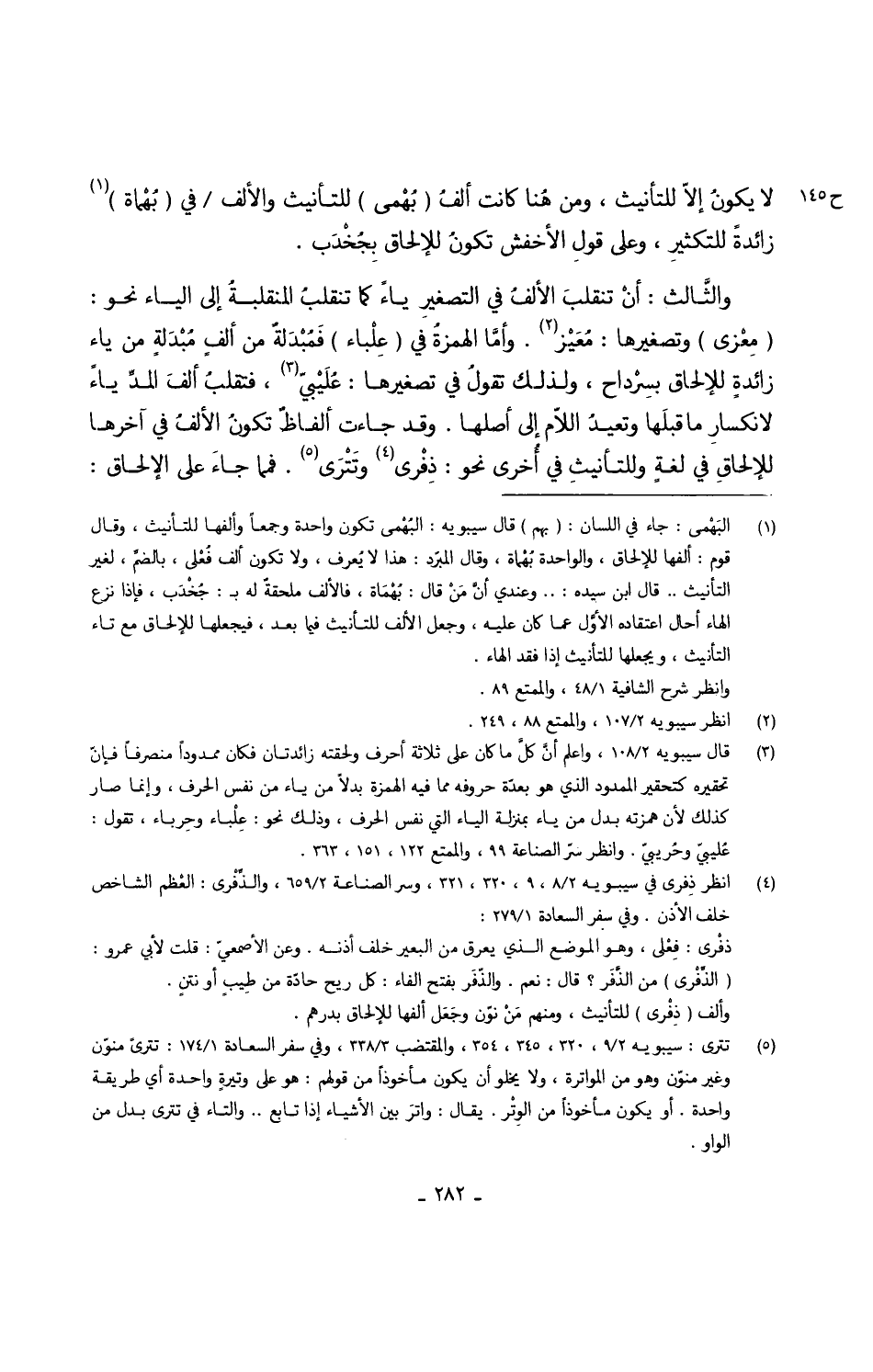 والثَّالث أَن تنقلبَ الألفُ فِي التصغير يَاء كَمَا تنقلبُ المنقلبةُ إِلَى الْيَاء نَحْو مِعْزى وتصغيرها مُعَيْز وأمَّا الهمزةُ فِي عِلْباء فَمُبْدَلةٌ من ألفٍ مُبْدَلةٍ من يَاء زائدةٍ للإلحاق بسِرْداح وَلذَلِك تقولُ فِي تصغيرها عُلَيْبيّ فتقلبُ ألفَ المدِّ يَاء لانكسارِ مَا قبلَها وتعيدُ اللاّم إِلَى أَصْلهَا وَقد جَاءَت ألفاظٌ تكونُ الألفُ فِي آخرهَا للإلحاقِ فِي لغةٍ وللتأنيثِ فِي أُخرى نَحْو ذِفْرى وتَتْرَى فمما جاءَ على الْإِلْحَاق