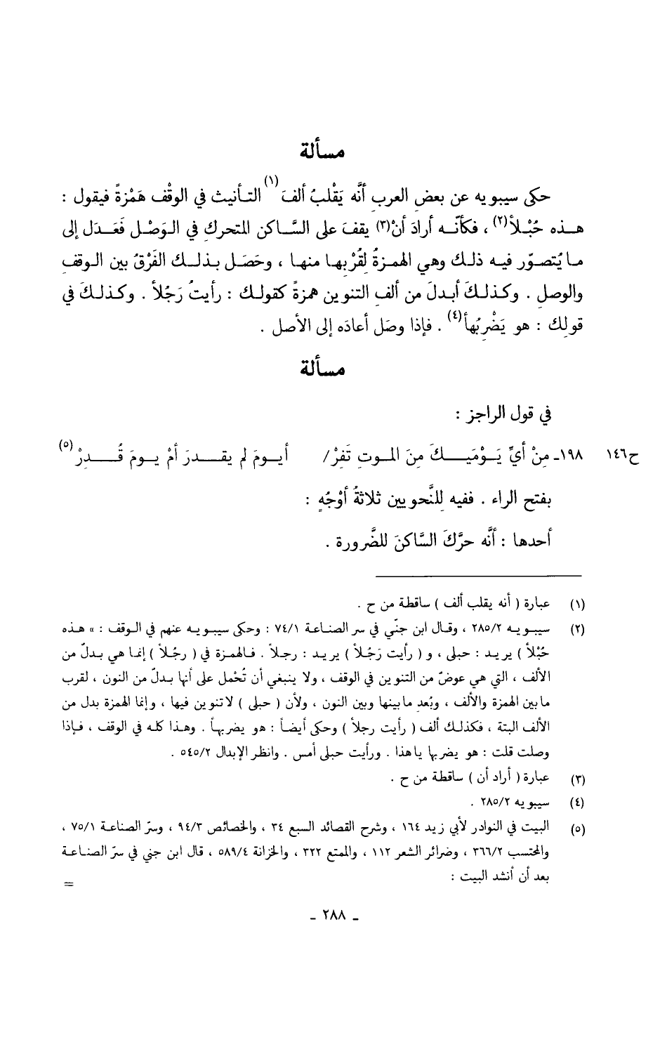 حكى سِيبَوَيْهٍ عَن بعضِ العربِ أنَّه يَقْلبُ ألفَ التَّأْنِيث فِي الوقْف هَمْزةً فَيَقُول هَذِه حُبْلاً فكأنّه أرادَ أنْ يقفَ على السَّاكن المتحركٍ فِي الوَصْل فَعَدَل إِلَى مَا يُتصوّر فِيهِ ذَلِك وَهِي الهمزةُ لِقُربِها مِنْهَا وحَصَل بذلك الفَرْقُ بَين الوقفِ والوصل وَكَذَلِكَ أبدلَ من ألفِ التَّنْوِين همزَة كَقَوْلِك رأيتُ رَجُلاً وَكَذَلِكَ فِي قولِك هُوَ يَضرِبُها فَإِذا وصَل أعادَه إِلَى الأَصْل