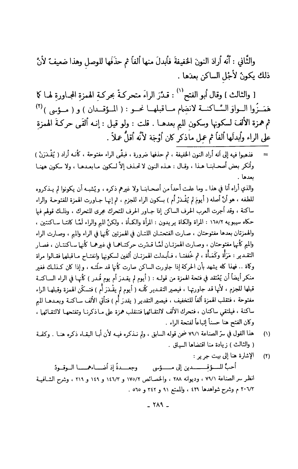 وَالثَّالِث وَقَالَ أَبُو الْفَتْح قدَّرَ الراءَ متحركةً بحركةِ الهمزةِ المجاورةِ لَهَا كَمَا هَمَزُا الواوَ السَّاكنة لانضِمام مَا قبلهَا نَحْو لمؤقدان ومؤسى ثمَّ همزَة الألفَ لسكونها وسكونِ الْمِيم بعْدهَا قلت وَلَو قيل إِنَّه ألقَى حركةَ الهمزةِ على الرَّاء وأبدلَها ألفا ثمَّ عمِل مَا ذكر كَانَ أوْجَهَ لأنَّه أقلُّ عملا