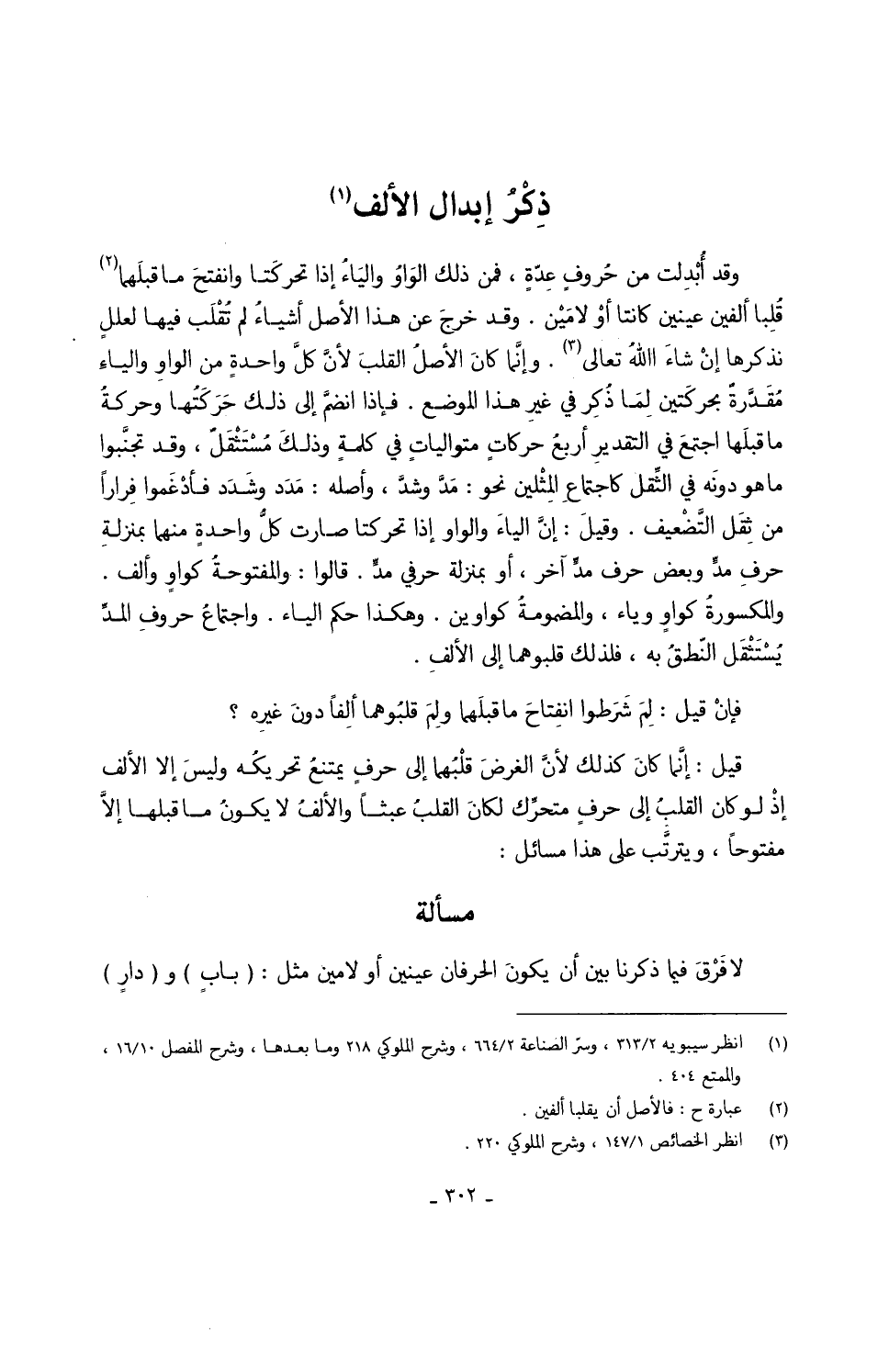 وَقد أُبْدِلت من حُروفٍ عِدّةٍ فَمن ذَلِك الوَاوُ واليَاءُ إِذا تحركتَا وانفتحَ مَا قبلَهما قُلِبا أَلفَيْنِ عينين كَانَتَا أوْ لامَيْن وَقد خرجَ عَن هَذَا الأَصْل أشياءُ لم تُقْلَب فِيهَا لعللٍ نذكرها إنْ شاءَ اللهُ تَعَالَى وإنَّما كانَ الأصلُ القلبَ لأنَّ كلَّ واحدةٍ من الواوِ والياءِ مُقَدَّرَةٌ بحركَتين لِمَا ذُكِر فِي غير هَذَا الْموضع فَإِذا انضمَّ إِلَى ذَلِك حَرَكَتُها وحركةُ مَا قبلَها اجتمعَ فِي التقديرِ أربعُ حركاتٍ متوالياتٍ فِي كلمةٍ وذلكَ مُسْتَثْقَلٌ وَقد تجنَّبوا مَا هُوَ دونَه فِي الثِّقل كاجتماعِ المِثْلين نَحْو مَدَّ وشدَّ واصله مَدَد وشَدَد فأدْغَموا فِراراً من ثِقَل التَّضْعيف وقيلَ إنَّ الياءَ وَالْوَاو إِذا تحركتا صَارَت كلُّ واحدةٍ مِنْهُمَا بِمَنْزِلَة حرفِ مدٍّ وَبَعض حرف مدٍّ آخر أَو بِمَنْزِلَة حرفي مدٍّ قَالُوا والمفتوحةُ كواوٍ وَألف والمكسورةُ كواوٍ وياء والمضمومةُ كواوين وَهَكَذَا حكم الْيَاء واجتماعُ حُرُوف المدِّ يُسْتَثْقَل النّطقَ بِهِ فَلذَلِك قلبوهما إِلَى الألفِ