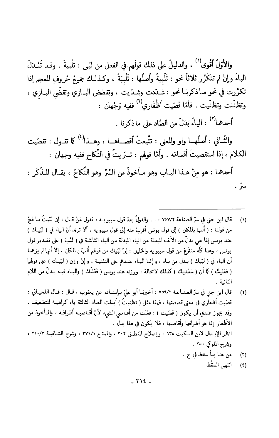 والأوّلُ أقْوى والدليلُ على ذَلِك قولُهم فِي الْفِعْل من لبّى تَلْبيةً وَقد تُبْدَلُ الباءُ وإنْ لم تتكَرَّر ثَلَاثًا نَحْو تَلْبِيةً وأصلُها تَلْبِيَةً وَكَذَلِكَ جميعُ حُروفِ المعجم إِذا تكرَّرت فِي نَحْو مَا ذكرنَا نَحْو شدّدت وشدّيت وتقضض الْبَازِي وتقضّيالبازِي وتظنّنت وتظنّيت فأمّا قَصّيت أظْفَاري فَفِيهِ وَجْهان