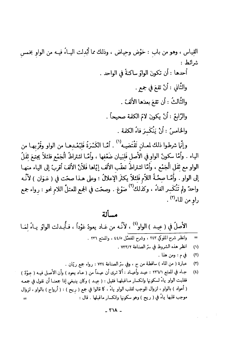 وإنّما شرطُوا ذَلِك لمعانٍ تَقْتَضيه أمَّا الكَسْرَةُ فَلِبُعْدِها من الْوَاو وقُرْبِها من الْيَاء وأمَّا سكونُ الواوِ فِي الأصلِ فَلِبَيان ضَعْفِها وأمَّا اشتراطُ الجَمْعِ فلئلا يجتمعَ ثِقَلُ الْوَاو مَعَ ثِقَلِ الجَمْع وأمَّا اشتراطُ تعقّبِ الْألف إيَّاها فَلأنَّ الألفَ أقربُ إِلَى الْيَاء مِنْهَا إِلَى الْوَاو وأمَّا صِحَّةُ اللاَّمِ فَلِئلاّ يكثرَ الإعلالُ وعَلى هَذَا صحّت فِي عَوَان لأنَّه واحدٌ وَلم تَنْكَسِر الفاءُ وَكَذَلِكَ صَوْغ وصحّت فِي الجمعِ المعتلِّ اللامِ نَحْو رِواء جمع راوٍ من المَاء