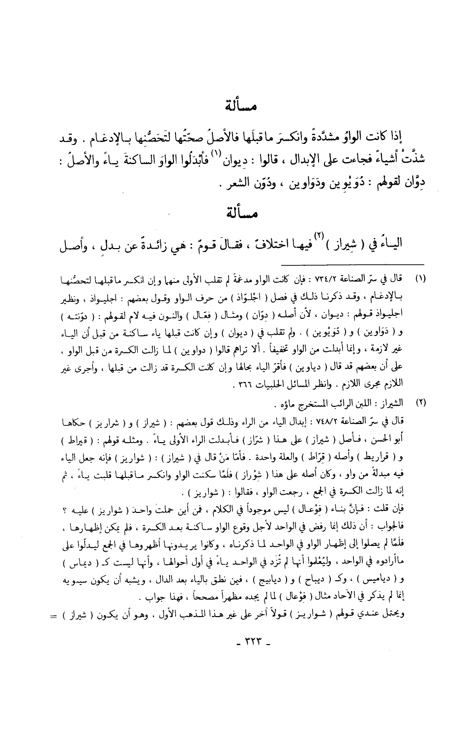 الياءُ فِي شيراز فِيهَا اختلافٌ فقالَ قومٌ هِيَ زائدةٌ عَن بدل وأصل