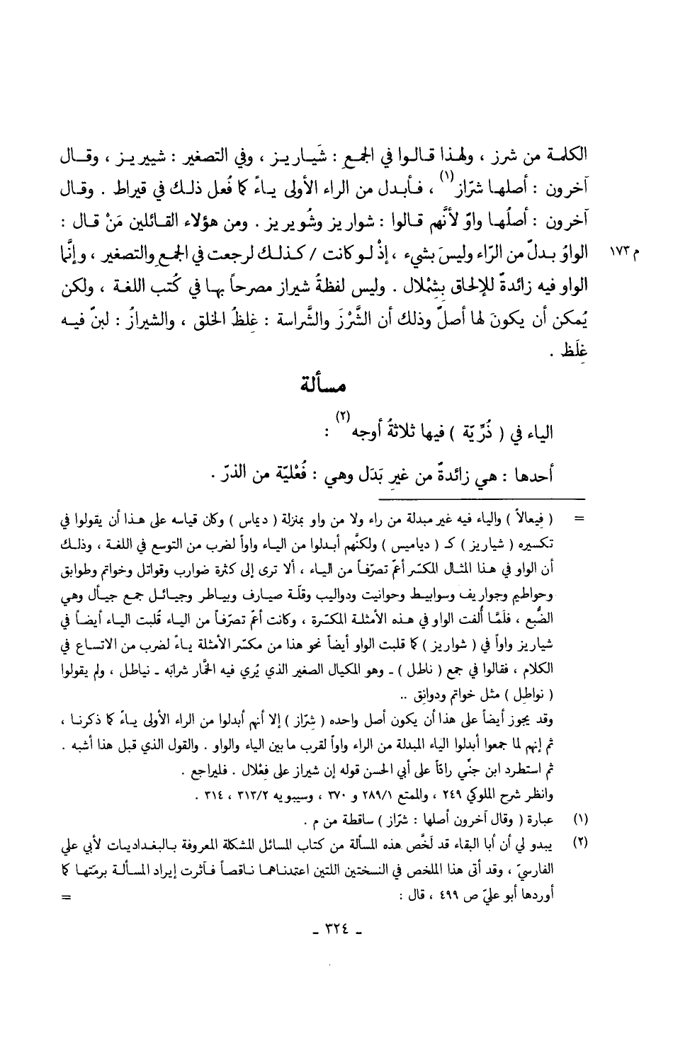 الْكَلِمَة من شرز وَلِهَذَا قَالُوا فِي الجمعِ شَياريز وَفِي التصغير شييريز وَقَالَ آخَرُونَ أَصْلهَا شرّاز فابدل من الرَّاء الأولى يَاء كَمَا فُعل ذَلِك فِي قِيرَاط وَقَالَ آخَرُونَ أصلُها واوٌ ولأنَّهم قَالُوا شواريز وشُويريز وَمن هَؤُلَاءِ الْقَائِلين مَنْ قَالَ الواوُ بدلٌ من الرّاء وليسَ بِشَيْء إذْ لَو كَانَت كَذَلِك لرجعت فِي الجمعِ والتصغير وإنَّما الْوَاو فِيهِ زائدةٌ للإلحاق بِشِمْلال وَلَيْسَ لفظُ شيراز مُصَرحًا بهَا فِي كُتب اللُّغَة وَلَكِن يُمكن أَن يكونَ لَهَا أصلٌ وَذَلِكَ أَن الشَّرْزَ والشَّراسة غِلظُ الْخلق والشيرازُ لبنٌ فِيهِ غِلَظ
