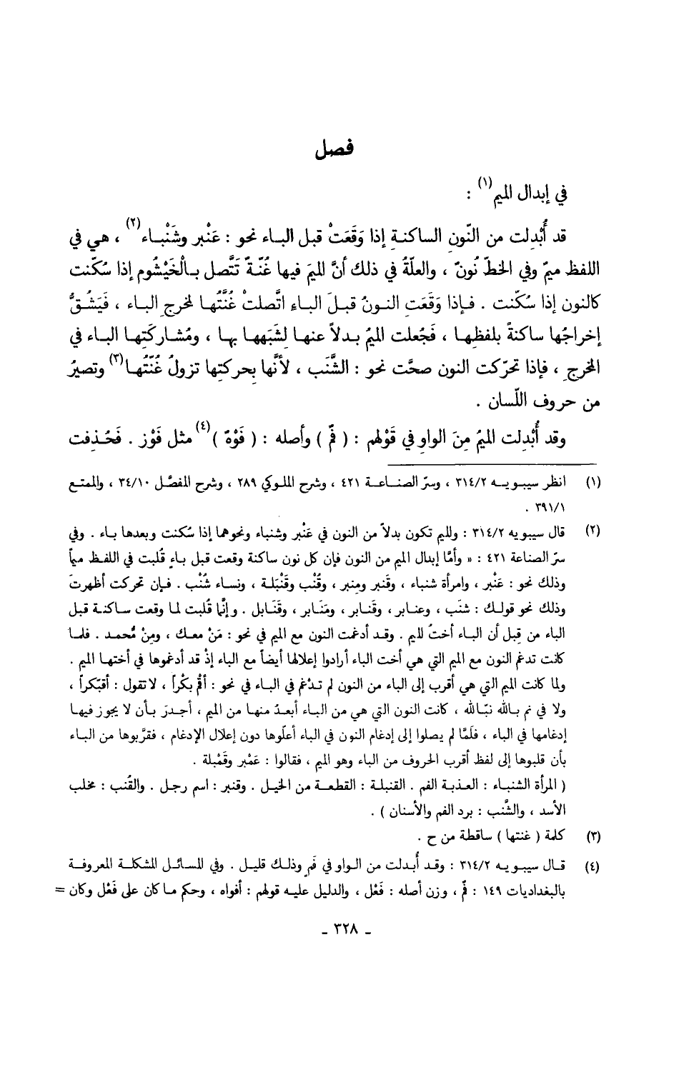 قد أُبْدِلت من النّونِ الساكنةِ إِذا وَقَعَتْ قبل الْبَاء نَحْو عَنْبر وشَنْباء هِيَ فِي اللَّفْظ ميمٌ وَفِي الخطّ نُونٌ والعلّةُ فِي ذَلِك أنَّ الميمَ فِيهَا غُنّةٌ تَتَّصل بالْخَيْشُوم إِذا سُكِّنت كالنون إِذا سُكِّنت فَإِذا وَقَعَتِ النونُ قبلَ الباءِ اتَّصلتْ غُنَّتُها لمخرجِ الْبَاء فَيَشُقُّ إخراجُها سَاكِنة بلفظِها فَجُعلت الميمُ بَدَلا عَنْهَا لِشَبَهها بهَا ومُشاركَتِها الْبَاء فِي المخرجِ فَإِذا تحرّكت النُّون صحَّت نَحْو الشَّنَب لأنَّها بِحركتِها تَزُول غُنَّتُها وتصيرُ من حُرُوف اللّسان
