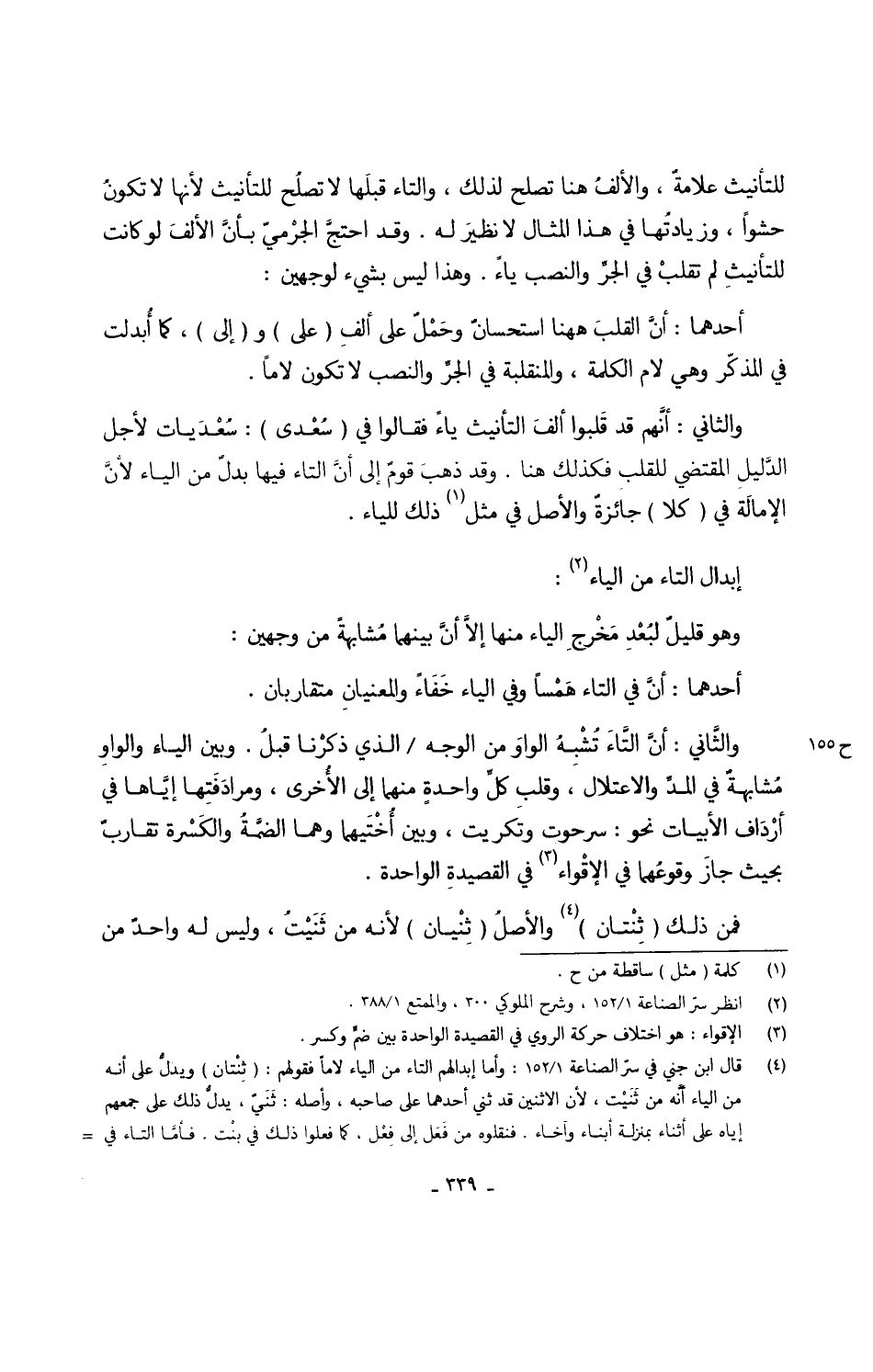 والثَّاني أنَّهم قد قَلبوا ألفَ التَّأْنِيث يَاء فَقَالُوا فِي سُعْدى سُعْدَيات لأجل الدَّليلِ الْمُقْتَضى للقلبِ فَكَذَلِك هُنَا وَقد ذهبَ قومٌ إِلَى أنَّ التَّاء فِيهَا بدلٌ من الْيَاء لأنَّ الإمالةِ فِي كلا جائزةٌ وَالْأَصْل فِي مثل ذَلِك للياء