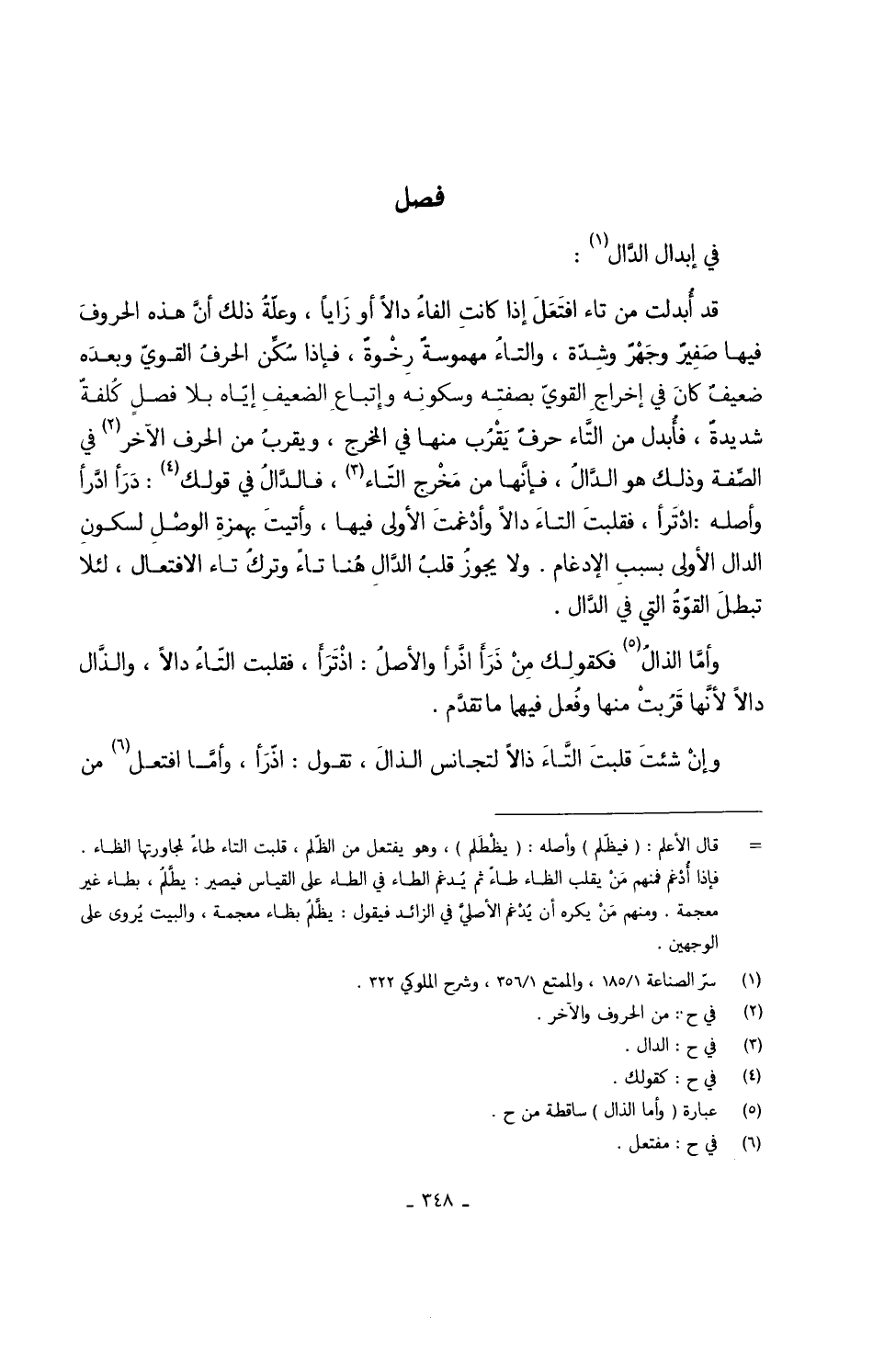 قد أبدلت من تَاء افتَعَلَ إِذا كانتِ الفاءُ دَالا أَو زاياً وعلّةُ ذَلِك أنَّ هَذِه الْحُرُوف فِيهَا صَفِيرٌ وجَهْرٌ وشِدَّة والتاءُ مهموسةٌ رِخْوةٌ فَإِذا سُكِّن الحرفُ القويّ وبعدَه ضعيفٌ كانَ فِي إخراجِ القويّ بصفتِه وسكونِه وإتباعِ الضعيفِ إيّاه بِلَا فصلٍ كُلفةٌ شديدةٌ فأُبدل من التَّاء حرفٌ يَقْرُب مِنْهَا فِي الْمخْرج ويقربُ من الْحَرْف الآخر فِي الصِّفة وَذَلِكَ هُوَ الدَّالُ فإنَّها من مَخْرج التّاء فالدَّالُ فِي قَوْلك دَرَأ ادَّرأ وَأَصله ادْتَرأ فقلبتَ التاءَ دَالا وأدْغمتَ الأولى فِيهَا وأتيتَ بهمزةِ الوصْلِ لسكونِ الدَّال الأولى بسببِ الْإِدْغَام وَلَا يجوزُ قلبُ الدَّالِ هَنا تَاء وتركُ تَاء الافتعال لِئَلَّا تبطلَ القوّةُ الَّتِي فِي الدَّال