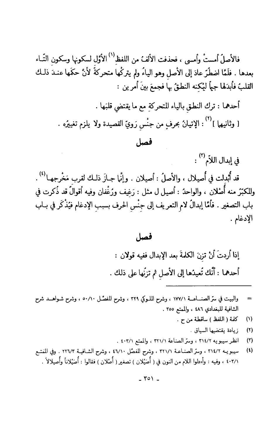 قد أُبْدِلت فِي أُصيلال والأصلُ أصيلان وإنَّما جازَ ذَلِك لقربِ مَخْرجها والمكبّرُ مِنْهُ أصْلان والواحدُ أصيل ل مثل رَغِيف ورُغْفان وَفِيه أقوالٌ قد ذُكرت فِي بَاب التصغير فأمَّا إبدالُ لامِ التَّعْرِيف إِلَى جِنْسِ الْحَرْف بسببِ الْإِدْغَام فيُذْكَر فِي بَاب الْإِدْغَام