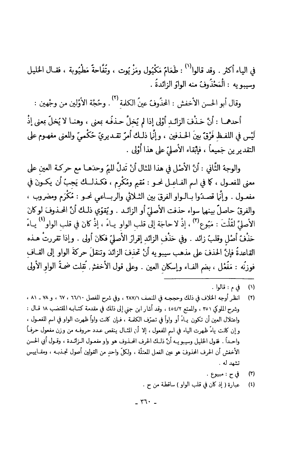 وَالْوَجْه الثَّاني أنَّ الأصْل فِي هَذَا الْمِثَال أنْ تَدلَّ الميمُ وحدَها مَعَ حَرَكَة العينِ على معنى الْمَفْعُول كَمَا فِي اسْم الفاعِل نَحْو مُقيم ومُكْرِم فَكَذَلِك يَجِبُ أَن يكونَ فِي مفعول وإنَّما قصدُوا بِالْوَاو الفرقَ بَين الثلاثي والرباعي نَحْو مُكْرَم ومضروب والفرقُ حاصلٌ بَينهمَا سَوَاء حذفت الأصليّ أَو الزَّائِد ويُقوّى ذَلِك أَن المحذوفَ لَو كانَ الأصليَّ لقُلْتَ مَبُوع إذْ لَا حاجَة إِلَى قلبِ الواوِ يَاء إذْ كانَ فِي قلب الْوَاو يَاء حَذْفُ أصْلٍ وقلبُ زَائِد وَفِي حَذْفِ الزائدِ إقرارُ الاصليّ فكانَ أولى وَإِذا تقررت هَذِه القاعدةُ فإنَّ الحذفَ على مَذْهَب سِيبَوَيْهٍ أَن تحذِفَ الزائدَ وتنقلَ حركةَ الْوَاو إِلَى القافِ فوزنُه مَفْعَل بِضَم الْفَاء وإسكانِ الْعين وعَلى قَول الْأَخْفَش نُقِلت ضمةُ الواوِ الأولى