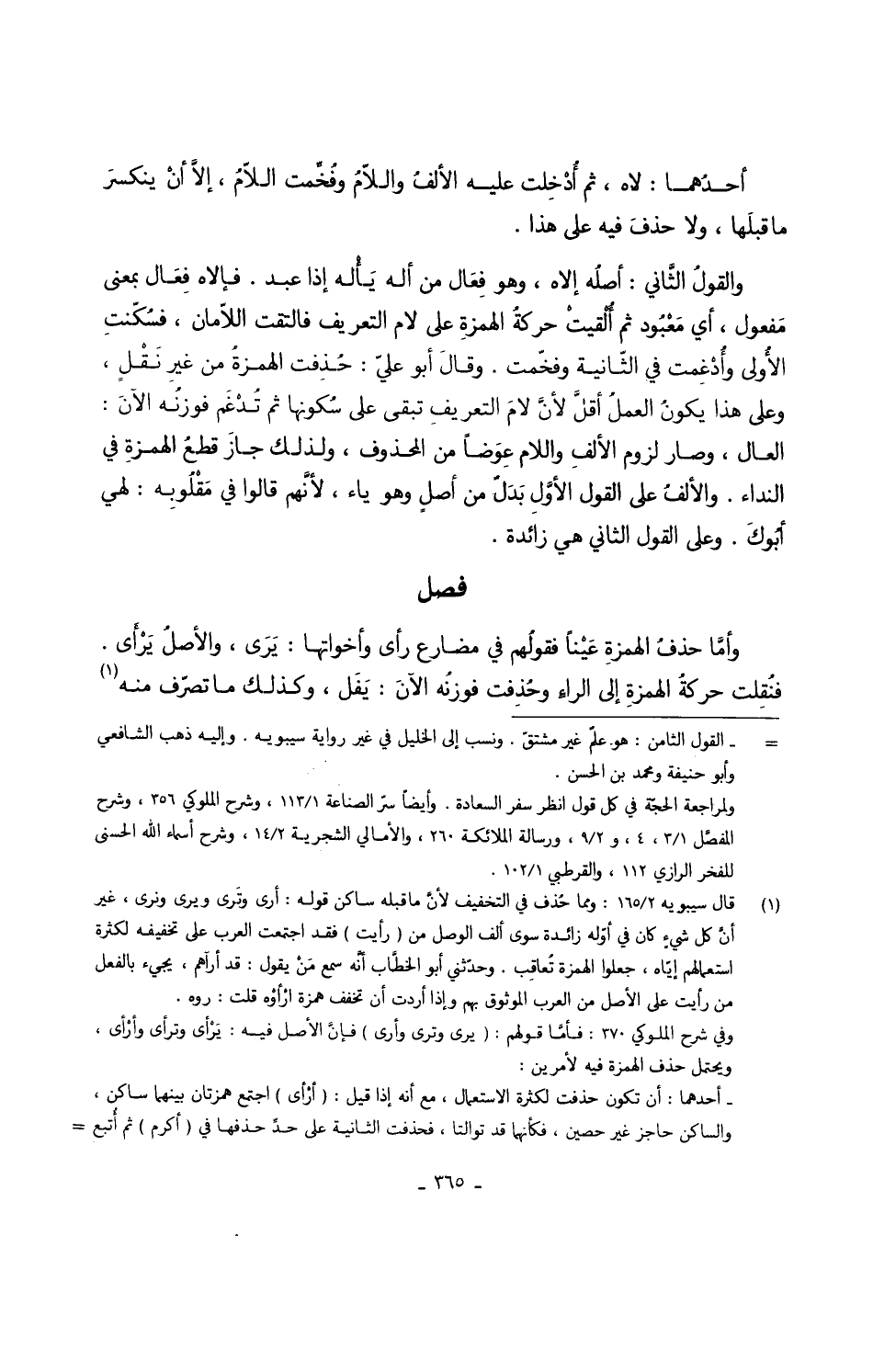 وأمّا حذفُ الهمزةِ عَيْناً فقولُهم فِي مضارع رأى وَأَخَوَاتهَا يَرَى والأصلُ يَرْأى فنُقِلت حركةُ الهمزةِ إِلَى الراءِ وحُذِفت فوزنُه الآنَ يَفَل وَكَذَلِكَ مَا تصرّف مِنْهُ