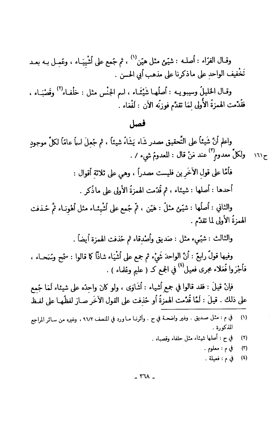 وَقَالَ الفرّاء أَصله شيّئ مثل هيّن ثمَّ جُمع على أشْيِيَاء وعُمِل بِهِ بعد تَخْفيف الواحدِ على مَا ذكرنَا على مَذْهَب أبي الْحسن