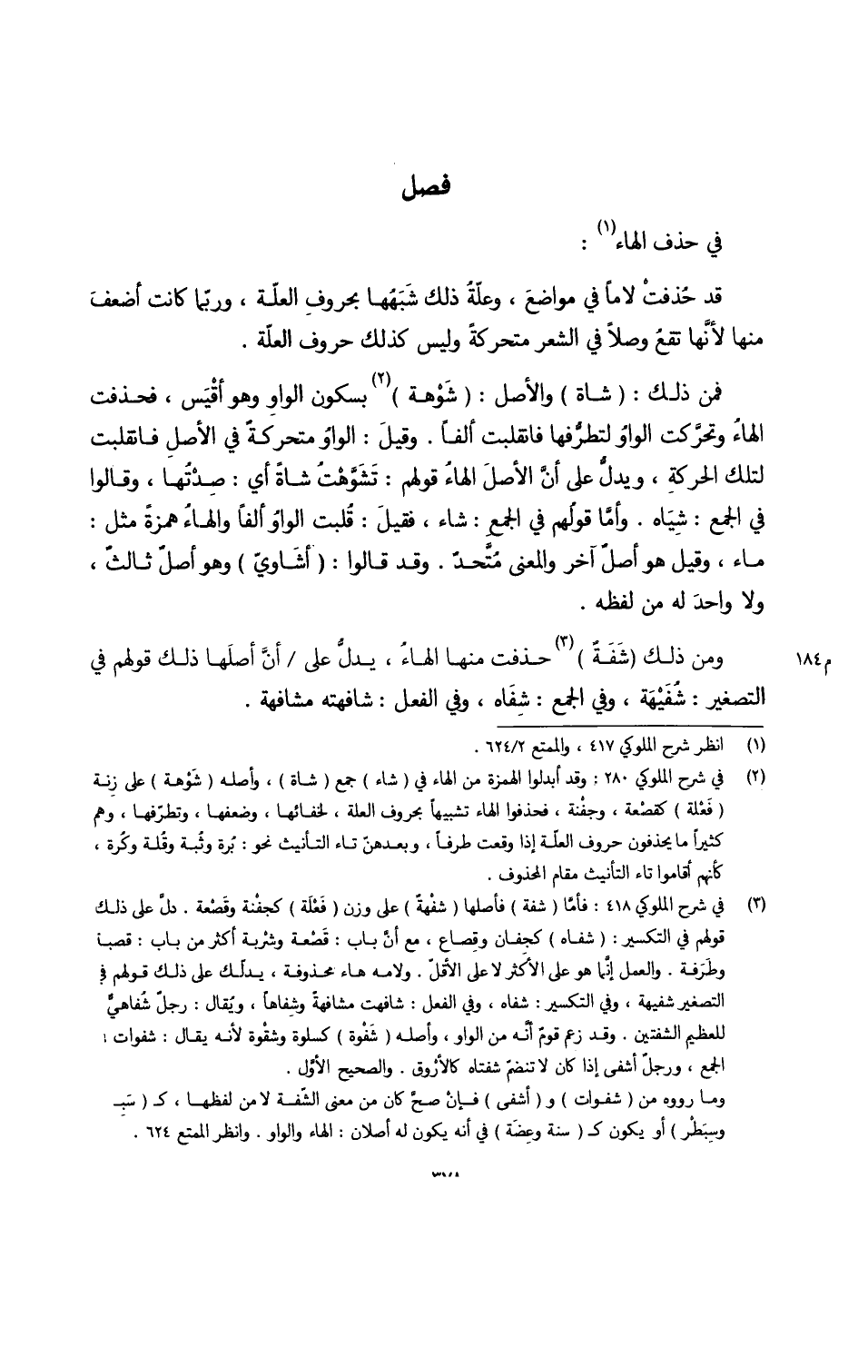 فَمن ذَلِك شَاة وَالْأَصْل شَوْهة بِسُكُون الواوِ وَهُوَ أقْيَس فحذفت الهاءُ وتحرَّكت الواوُ لتطرُّفها فَانْقَلَبت ألفا وقيلَ الواوُ متحركةٌ فِي الأصلِ فَانْقَلَبت لتِلْك الحركةِ ويدلُّ على أنَّ الأصلَ الهاءُ قَوْلهم تَشَوَّهْتُ شَاة أَي صِدْتُها وَقَالُوا فِي الْجمع شِيَاه وأمَّا قولُهم فِي الجمعِ شَاءَ فقيلَ قُلبت الواوُ ألفا والهاءُ همزَة مثل مَاء وَقيل هُوَ أصلُ آخر وَالْمعْنَى مُتَّحدٌ وَقد قَالُوا أشاويّ وَهُوَ أصلٌ ثالثٌ وَلَا واحدَ لَهُ من لَفظه