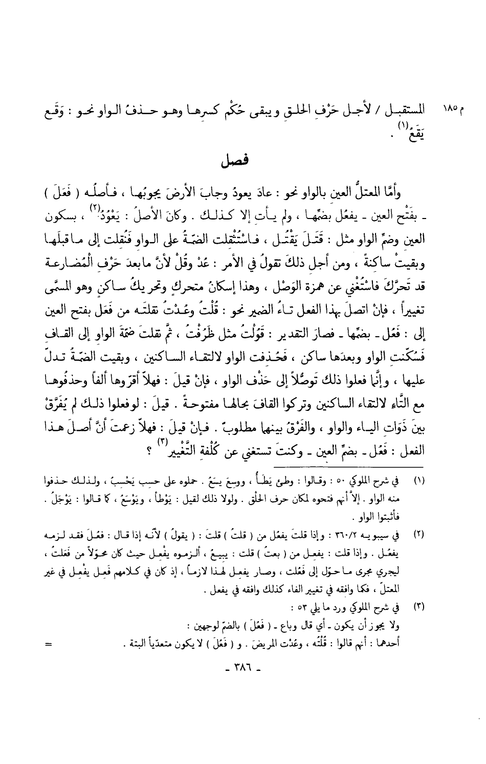 وأمَّا المعتلُّ الْعين بِالْوَاو نَحْو عادَ يعودُ وجابَ الأرضَ يجوبُها فأصلُه فَعَلَ بفَتْح الْعين يفعُل بضمِّها وَلم يأتِ إِلَّا كَذَلِك وكانَ الأصلُ يَعْوُدُ بِسُكُون العينِ وضمِّ الْوَاو مثل قَتَل يَقْتُل فاسْتُثْقِلت الضمّةُ على الواوِ فَنُقِلت إِلَى مَا قبلهَا وَبقيت ساكِنةً وَمن أجلِ ذَلِك تقولُ فِي الْأَمر عُدْ وقُل لأنَّ مَا بعدَ حَرْفِ المُضارعة فقد تَحرَّكَ فاسْتُغْني عَن همزَة الوَصْل وَهَذَا إسكانُ متحركٍ وتحريكُ ساكنٍ وَهُوَ المسمَّى تغييراً فإنْ اتصلَ بِهَذَا الْفِعْل تاءُ الضَّمِير نَحْو قُلْتُ وعُدْتُ نقلتَه من فَعَل بِفَتْح الْعين إِلَى فَعُل بضمِّها فصارَ التَّقْدِير قَوُلتُ مثل ظَرُفْتُ ثمَّ نقلتَ ضمةَ الواوِ إِلَى القافِ فَسُكّنتِ الْوَاو وبعدَها سَاكن فَحُذِفت الْوَاو لالتقاء الساكنين وَبقيت الضمّةُ تدلّ عَلَيْهَا وإنَّما فعلوا ذَلِك تَوصُّلاً إِلَى حَذْف الْوَاو فإنْ قيلَ فَهَلا أقرّوها ألفا وحذفُوها مَعَ التَّاء لالتقاء الساكنين وَتركُوا القافَ بِحَالِهَا مَفْتُوحَة قيلَ لَو فعلوا ذَلِك لم يُفَرَّقْ بَين ذَوَاتِ الْيَاء وَالْوَاو والفَرْقُ بَينهمَا مطلوبٌ فإنْ قيلَ فَهَلا زعمتَ أنَّ أصلَ هَذَا الْفِعْل فَعُل بضمِّ الْعين وكنتَ تَسْتَغْنِي عَن كلفة التَّغْيِير