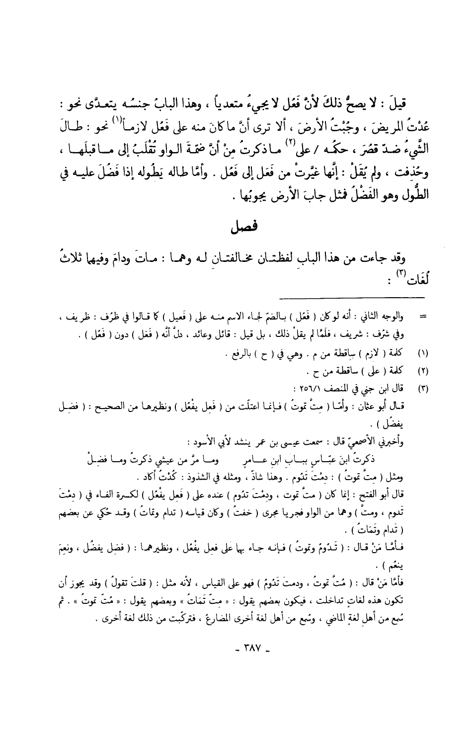 وَقد جَاءَت من هَذَا البابِ لفظتان مخالفتانِ لَهُ وهما ماتَ ودامَ وَفِيهِمَا ثلاثٌ لُغَات