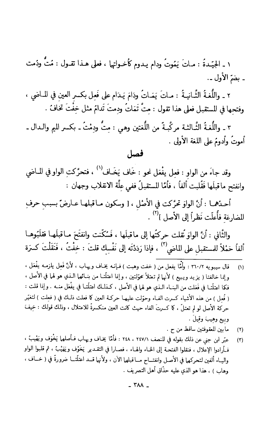 وَقد جاءَ من الواوِ فعِل يفْعَل نَحْو خَاف يَخَاف فتحرَّكتِ الْوَاو فِي الْمَاضِي وَانْفَتح مَا قبلَها فَقُلبت ألفا فأمَّا المستقبلُ فَفِي عِلَّة الانقلاب وَجْهَان