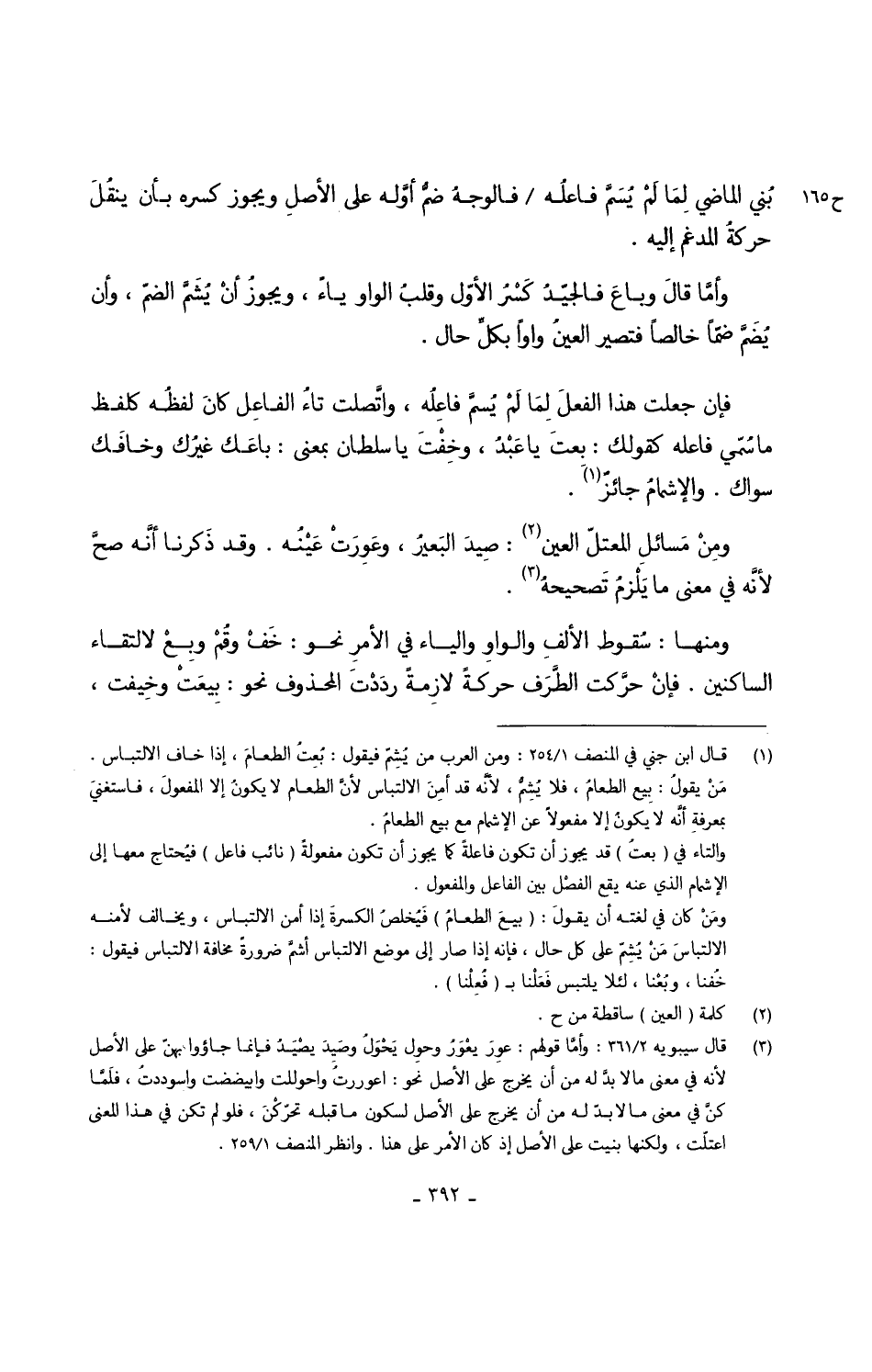 وَمِنْهَا سٌوط الألفِ والواوِ وَالْيَاء فِي الأمرِ نَحْو خَفْ وقُمْ وبِعْ لالتقاء الساكنين فإنْ حرِّكت الطَّرَف حَرَكَة لازِمةً ردَدْتَ الْمَحْذُوف نَحْو بِيعَتْ وخِيفت