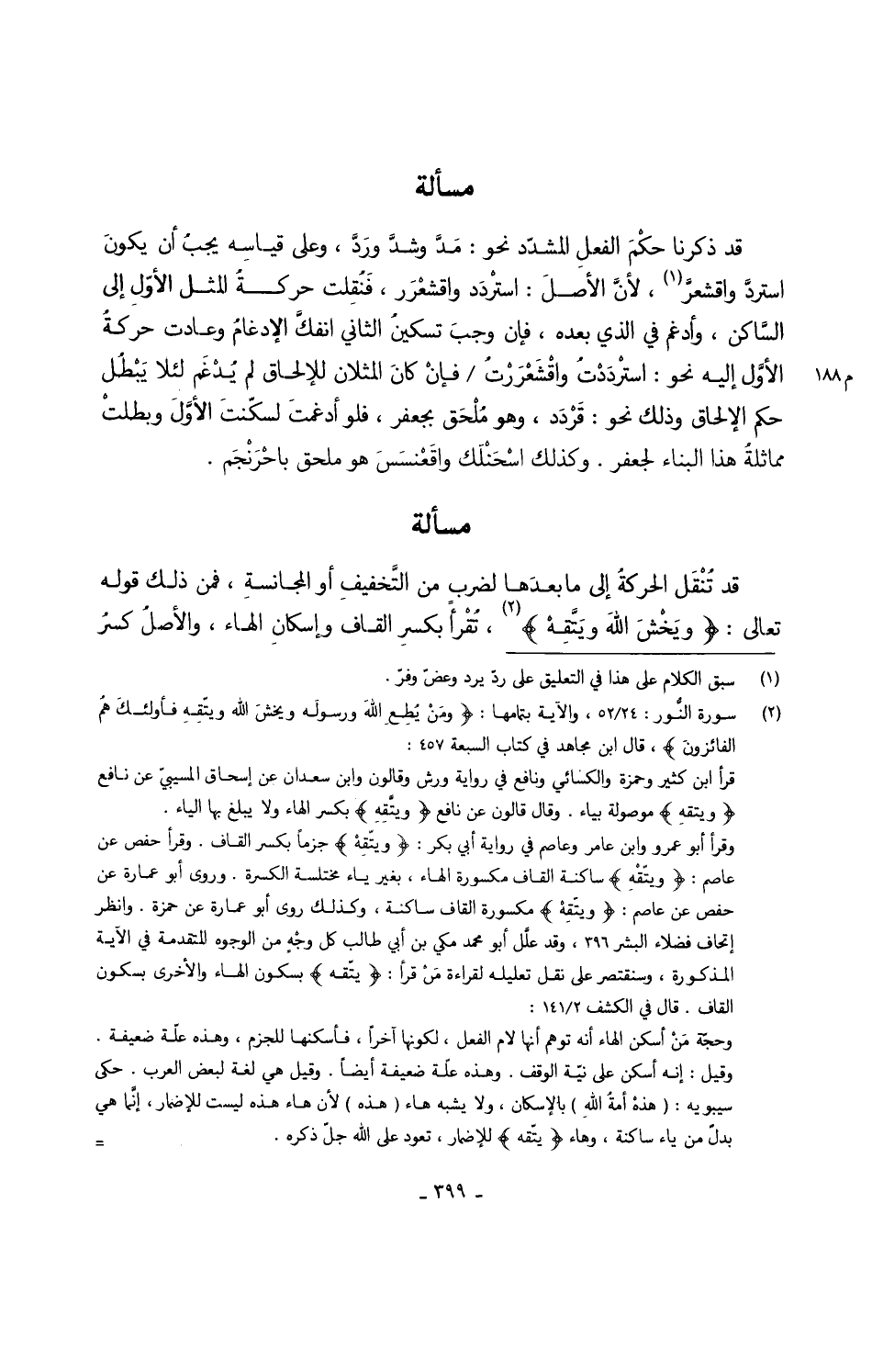 قد ذكرنَا حكْمَ الفعلِ المشدّد نَحْو مَدَّ وشدَّ ورَدَّ وعَلى قياسِه يجبُ أَن يكونَ استردَّ واقشعرَّ لأنَّ الأصلَ اسْتردَد واقشعْرَر فَنُقِلت حركةُ الْمثل الأوّلِ إِلَى السّاكن وأدغم فِي الَّذِي بعده فَإِن وجبَ تسكينُ الثَّانِي انفكَّ الإدغامُ وعادت حركةُ الأوَّل إِلَيْهِ نَحْو استرْدَدْتُ واقْشَعْرَرْتُ فإنْ كانَ المثلان للإلحاق لم يُدْغَم لِئَلَّا يَبْطُل حكم الْإِلْحَاق وَذَلِكَ نَحْو قَرْدَد وَهُوَ مُلْحَق بِجَعْفَر فَلَو أدغمتَ لسكّنتَ الأوَّلَ وبطلتْ مماثلةً هَذَا الْبناء لجَعْفَر وَكَذَلِكَ اسْحَنْلَك واقَعْنسَسَ هُوَ مُلْحق باحْرَنْجَم