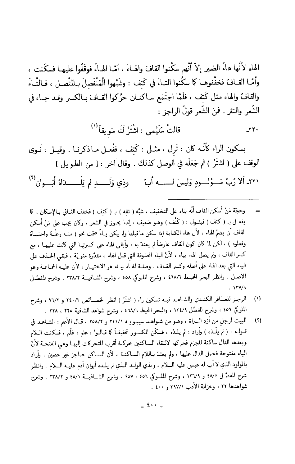 الْهَاء لأنَّها هاءُ الضَّمِير إلاّ أنَّهم سكَّنوا القافَ والهاءَ أمَّا الهاءُ فوقَفُوا عَلَيْهَا فسكّنت وأمَّا القافُ فخفَّفوها كَمَا سكَّنوا التاءَ فِي كَتِف وشَبَّهوا المُنْفَصِلَ بالمتَّصل فالتَّاءُ والقافُ وَالْهَاء مثل كَتِف فلَمَّا اجتَمَعَ ساكنان حرَّكوا القافَ بِالْكَسْرِ وَقد جَاءَ فِي الشّعر والنثر فمنَ الشّعر قولُ الراجز