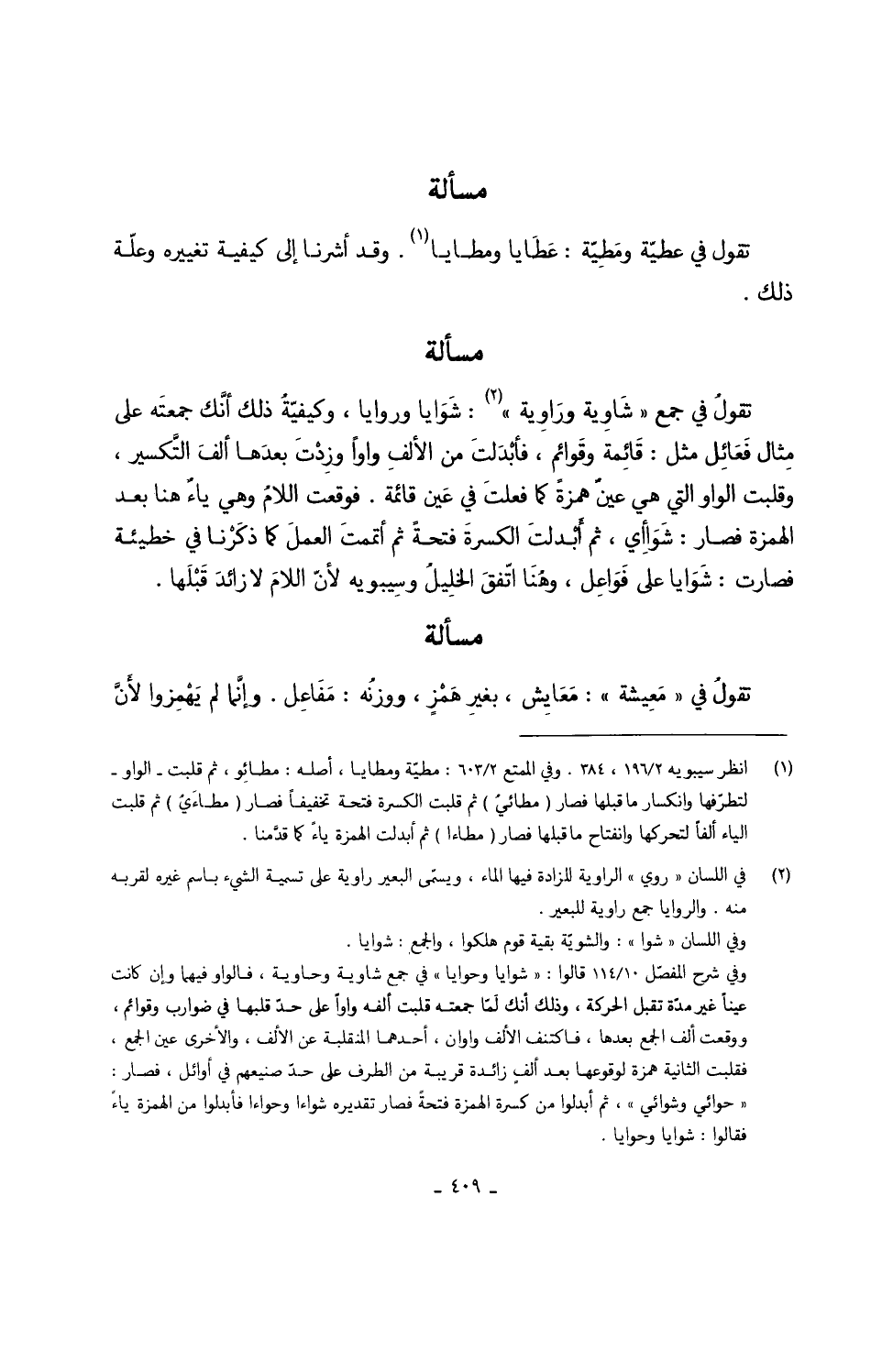 تقولُ فِي جمع شَاوية ورَاوية شَوَايا وروايا وكيفيّةُ ذَلِك أنَّك جمعتَه على مِثَال فَعَائِل مثل قَائِمة وقَوائم فابْدَلتَ من الألفِ واواً وزِدْتَ بعدَها ألفَ التَّكسير وقلبت الْوَاو الَّتِي هِيَ عينٌ همزَة كَمَا فعلتَ فِي عَين قَائِمَة فَوَقَعت اللامُ وَهِي ياءٌ هُنَا بعد الْهمزَة فَصَارَ شَوَاأِي ثمَّ أبْدلتَ الكسرةَ فَتْحة ثمَّ أتممتَ العملَ كَمَا ذكَرْنا فِي خَطِيئَة فَصَارَت شَوَايا على فَوَاعِل وهُنَا اتّفقَ الخليلُ وسِيبويه لأنّ اللامَ لَا زائدَ قَبْلَها