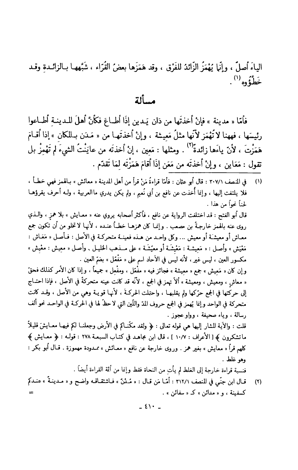 فأمّا مَدِينَة فإنْ أخذتَها من دَان يَدين إذَا أطاعَ فَكأنَّ أهلَ المدينةِ أطاعوا رئيسَها فههنا لَا تُهْمَزُ لأنّها مثلُ مَعِيشة وإنْ أخذتَها من مَدَن بالمكانِ إِذا أقامَ هَمَزْتَ لأنّ ياءها زائدةٌ وَمثلهَا مَعِين إنْ أخذتَه من عايَنْتُ الشيءَ لم تَهْمِزْ بل تَقول مَعَاين وإنْ أخذتَه من مَعَن إذَا أقامَ هَمَزْتَه لِمَا تَقدّم