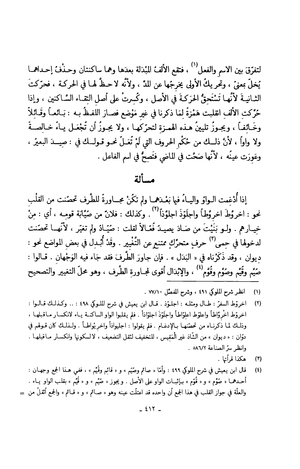 إِذا أُدْغِمت الواوُ والياءُ فِيمَا بَعْدَهما وَلم تكُنْ مجاورةً للطَّرف تحصّنت من القلْبِ نَحْو اخروَّطَ اخرِوَّطاً واجلَوّذَ اجلوَّذاً وَكَذَلِكَ فلانٌ من صُيَّابَة قومِه أَي مِنْ خِيارهم وَلَو بَنَيْتَ من صَادَ يصيدُ فُعّالاً لَقلت صُيّادُ وَلم تغيّر لأنّها تحصّنت لدخولها فِي حِمى حرفٍ متحرِّكٍ ممتنعٍ عَن التَّغْيير وقَدْ أُبْدِل فِي بعضِ الْمَوَاضِع نَحْو دِيوان وَقد ذَكَرْناه فِي البَدَل فَإِن جاورَ الطَّرفَ فقد جاءَ فِيهِ الوَجْهانِ قَالُوا صُيِّم وقُيِّم وصُوِّم وقُوِّم والإبْدّال أقوى لمجاورةِ الطَّرف وَهُوَ محلّ التَّغْيِير والتصحيح
