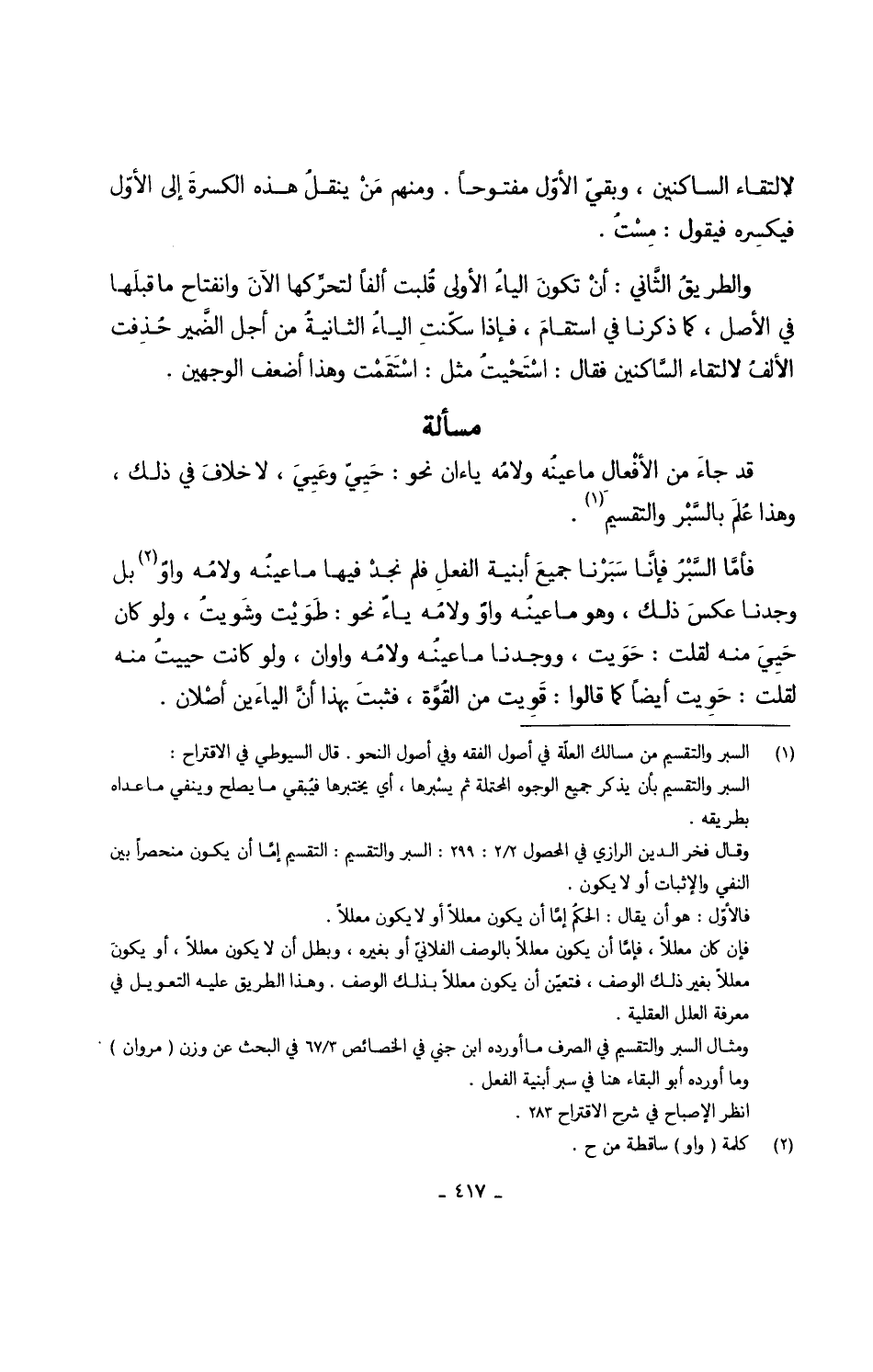 فأمَّا السَّبْرُ فإنَّا سَبَرْنا جَمِيع أبنية الفعلِ فَلم نجدْ فِيهَا مَا عينُه ولامُه واوٌ بل وجدنَا عكسَ ذَلِك وَهُوَ مَا عينُه واوٌ ولامُه ياءٌ نَحْو طَوَيْت وشَويتُ وَلَو كَانَ حَيِيَ مِنْهُ لَقلت حَوَيت وَوجدنَا مَا عينُه ولامُه واوان وَلَو كَانَت حييتُ مِنْهُ لَقلت حَوِيت أَيْضا كَمَا قَالُوا قَوِيت من القُوَّة فثبتَ بِهَذَا أنَّ الياءَين أصلان