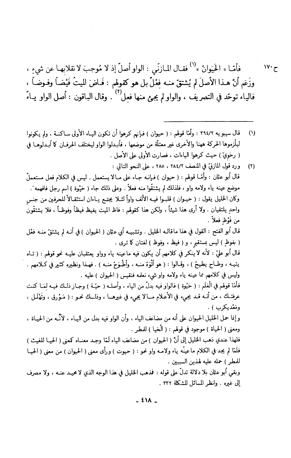 فأمّا الحَيَوانُ فَقَالَ المازنيّ الْوَاو أصلٌ غذ لَا مُوجبَ لانقلابِها عَن شيءٍ وزَعَم أنَّ هَذَا الأصلَ لم يُشتقّ مِنْهُ فِعْلٌ بل هُوَ كَقَوْلِهِم فَاضَ الميتُ فَيْضاً وفوضاً فالياء توحّد فِي التصريف وَالْوَاو لم يَجِيء مِنْهَا فعِل وَقَالَ الْبَاقُونَ اصل الْوَاو ياءٌ